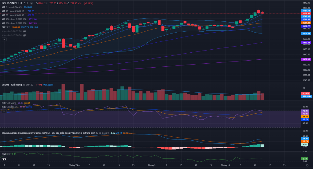 - Hình thái nến: Nến đỏ thân nhỏ, giảm -3.11 điểm (-0.18%) tại mức 1,757.95 điểm. Nến có bóng trên và bóng dưới ngắn, cho thấy sự giằng co mạnh mẽ nhưng không quá hoảng loạn.