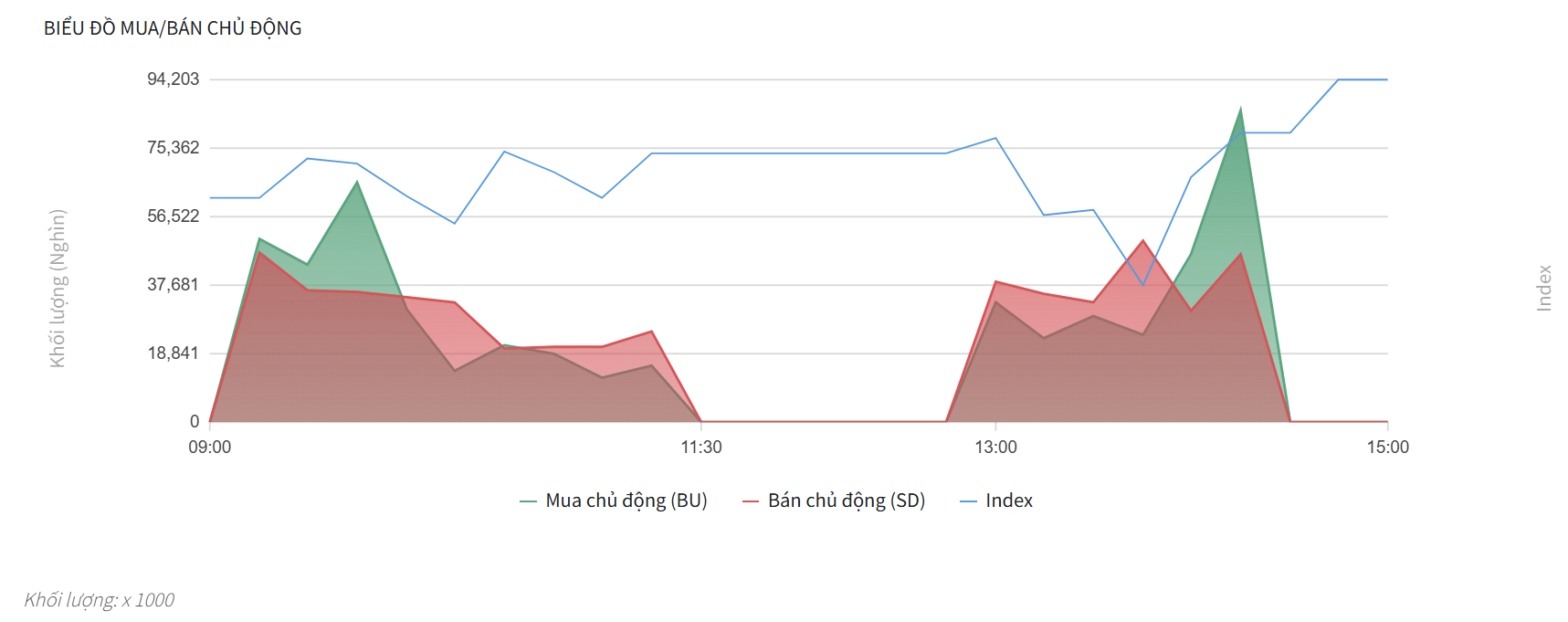 • Phiên chiều (13h00 – 14h30): Phiên chiều chứng kiến sự chi phối của phe mua, đặc biệt là ở cuối phiên.
