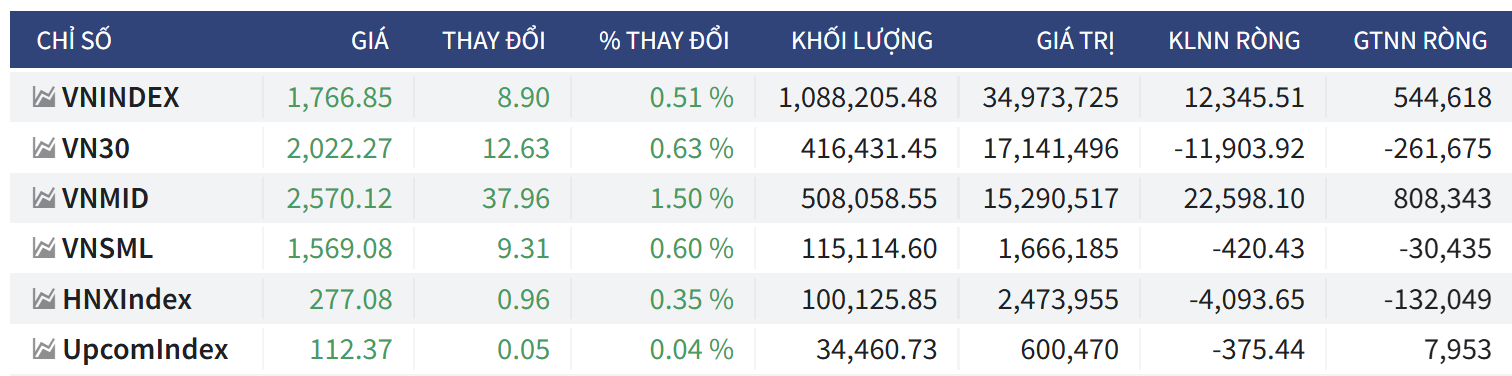 4. Chốt phiên, VN-Index tăng 8,9 điểm (+0,51%) lên mức 1.766,85 điểm; HNX-Index tăng 0,96 điểm (+0,35%) lên 277,08 điểm; UPCoM-Index tăng nhẹ 0,05 điểm (+0,04%0 lên 112,37 điểm