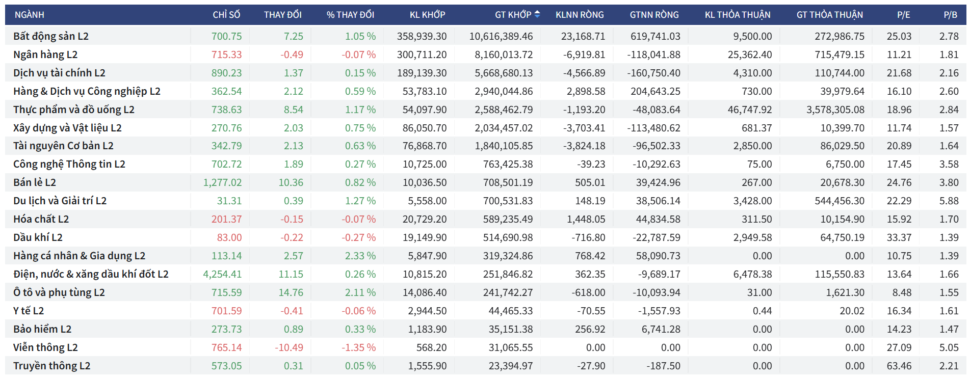 • Nhóm Bất động sản dẫn dắt: Các nhóm ngành có giá trị giao dịch lớn nhất và dẫn dắt đà tăng là:
