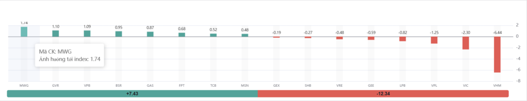 - MWG (Thế giới Di động): Là cổ phiếu dẫn đầu đà tăng, đóng góp +1.74 điểm cho chỉ số.