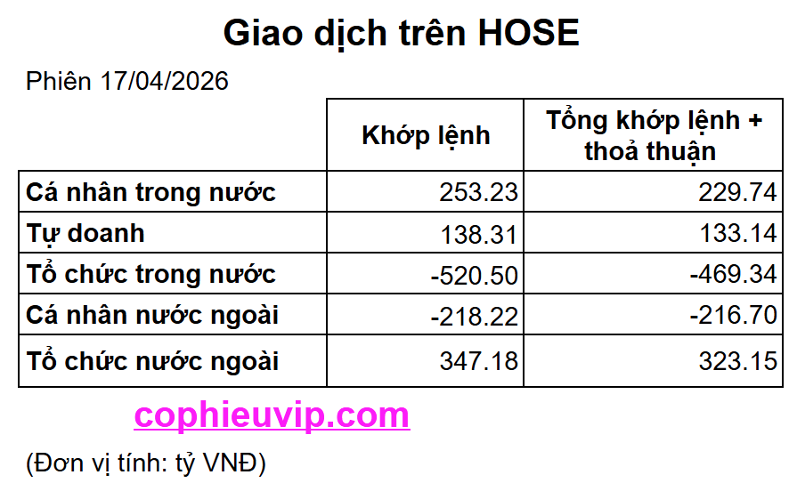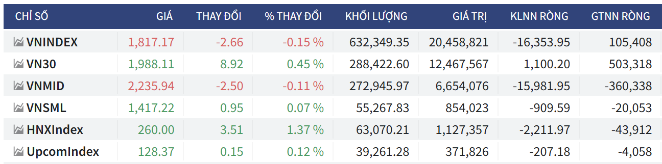 - Chỉ số VNINDEX: Đóng cửa tại mức 1,817.17 điểm, giảm -2.66 điểm (tương đương -0.15%). Khối lượng giao dịch đạt 632,349.35 đơn vị với tổng giá trị giao dịch là 20,458,821 triệu VNĐ. Khối ngoại mua ròng với giá trị 105,408 triệu VNĐ.