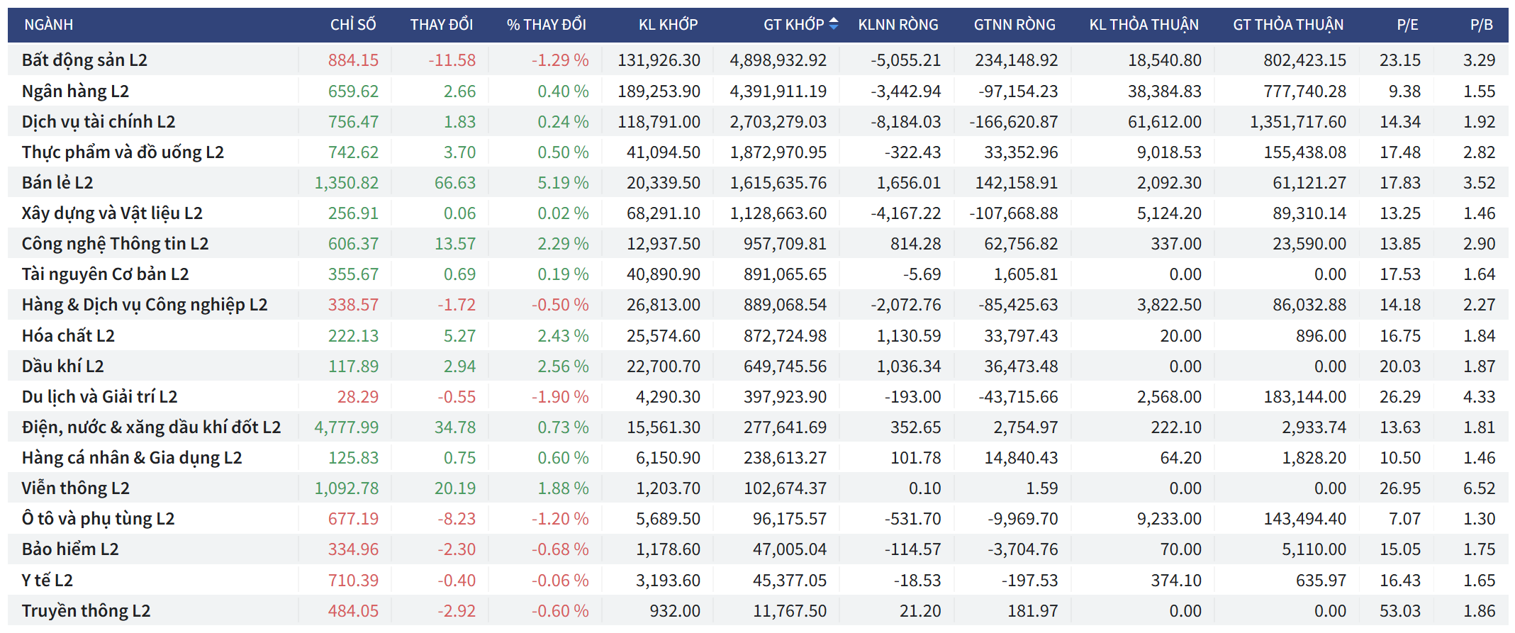 - Chỉ số VN30: Đạt 1,988.11 điểm, tăng +8.92 điểm (tương đương +0.45%). Khối lượng giao dịch là 288,422.60 đơn vị, giá trị giao dịch đạt 12,467,567 triệu VNĐ. Đây là nhóm nhận được lực cầu ngoại mạnh nhất với giá trị mua ròng 503,318 triệu VNĐ.