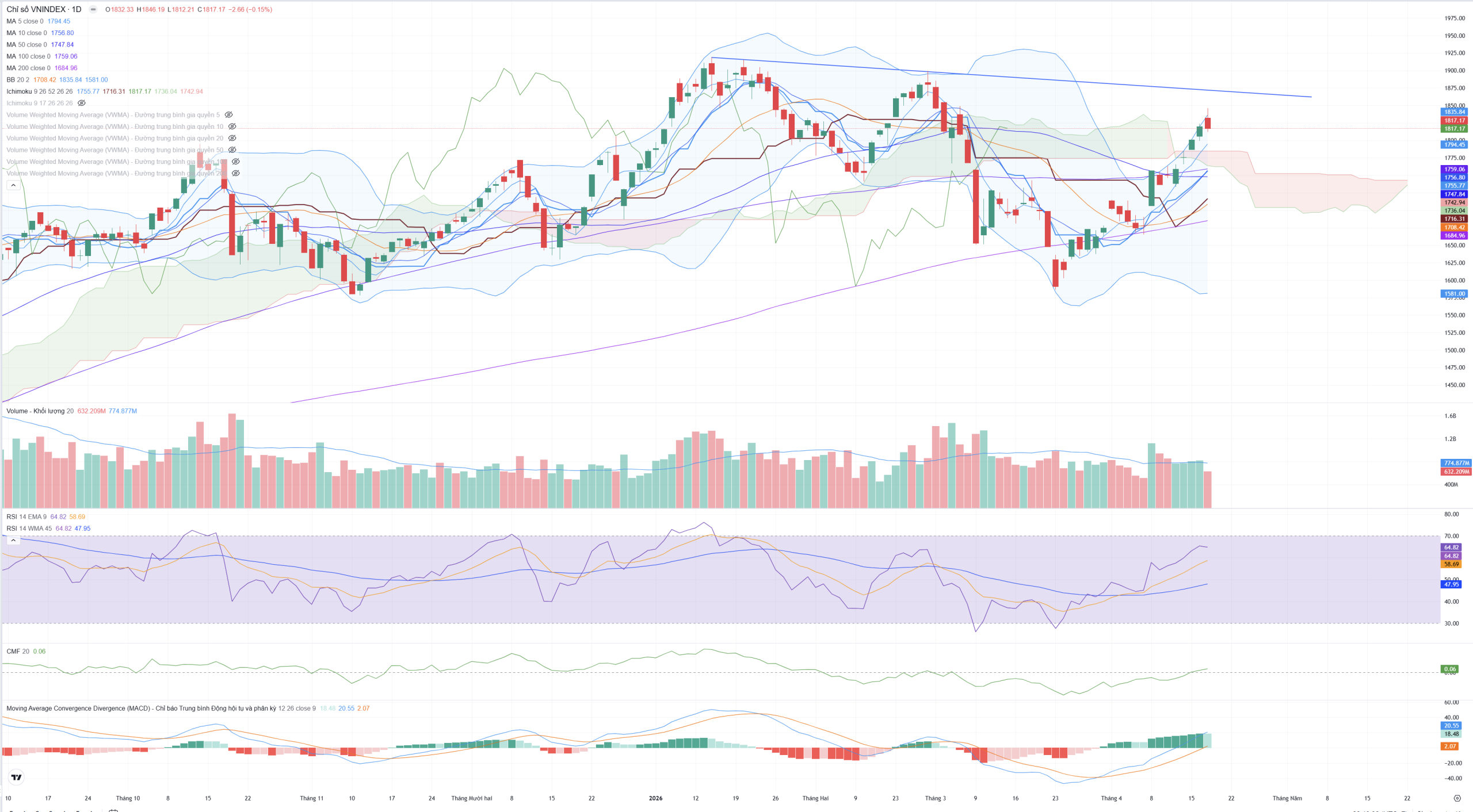 - Giá vẫn đang nằm trên toàn bộ các đường trung bình động: MA5 (1.794,45), MA10 (1.756,80) và MA20 (1.708,42).