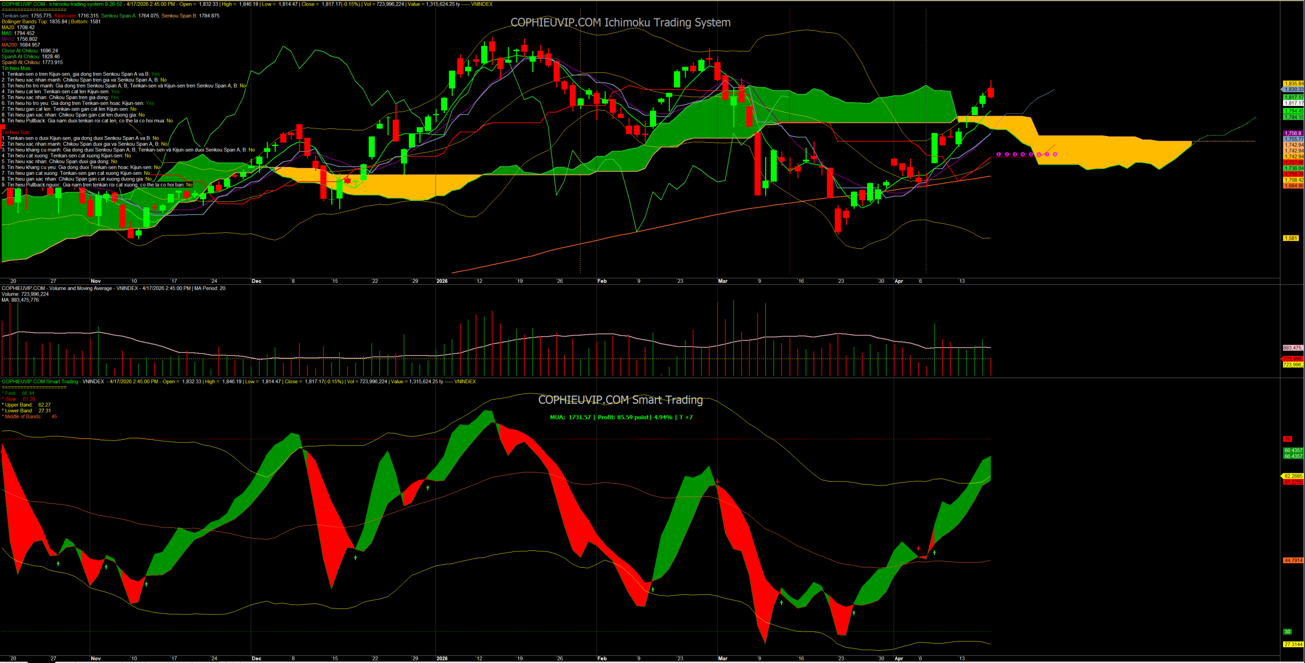 Phiên giao dịch ngày 17/04/2026 là một phiên “tẩy trần” sau cơn say đáo hạn phái sinh. Việc xuất hiện nến Shooting Star ngay tại vùng kháng cự cùng với Phân kỳ ẩn giảm giá là lời cảnh báo đanh thép về nhịp điều chỉnh sắp tới. Mặc dù độ rộng thị trường cải thiện (xanh lòng đỏ vỏ), nhưng khi các “đầu tàu” như VHM, VIC quay đầu giảm sâu, tâm lý thị trường chung sẽ bị ảnh hưởng nặng nề. Nhà đầu tư tuyệt đối không mua mới, ưu tiên hạ tỷ trọng margin và quan sát ngưỡng hỗ trợ 1.800 điểm.