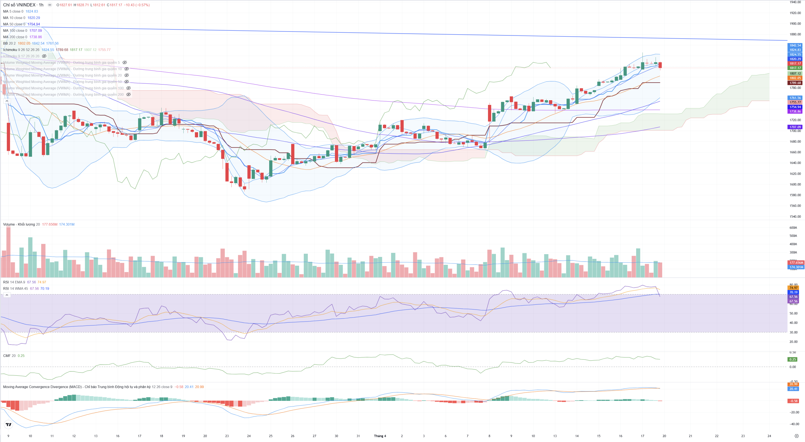 - Đỉnh giá ngày 17/04: 1.846,19 | RSI: 64,82.