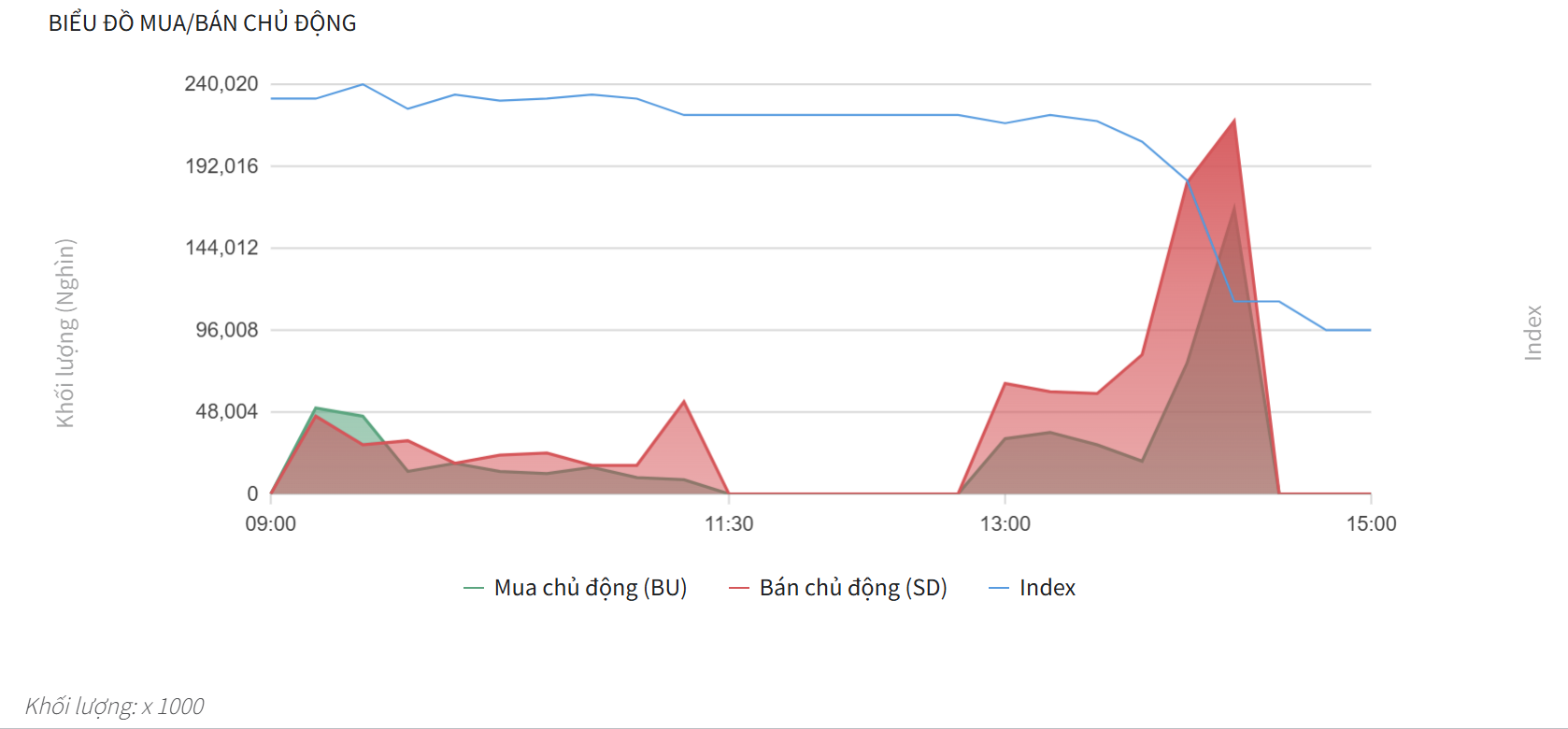- Áp lực Bán Chủ động tái chiếm ưu thế: Sau 9:30, lực Bán chủ động tăng vọt, chiếm ưu thế tuyệt đối so với lực Mua chủ động.