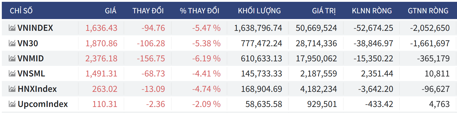 - VN-Index giảm 94,76 điểm (-5,47%), xuống 1.636,43 điểm; HNX-Index giảm 13,09 điểm (-4,74%), xuống 263,02 điểm; UPCoM-Index giảm 2,36 điểm (-2,09%) xuống 110,31 điểm