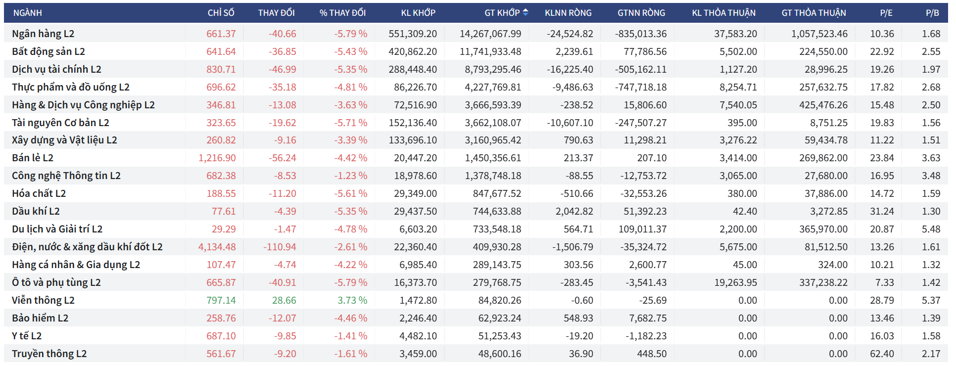 - Sự bán tháo lan tỏa: Sắc đỏ chiếm ưu thế áp đảo trên bảng điện tử các ngành. Hầu hết các nhóm ngành đều giảm điểm rất mạnh, với mức giảm trung bình trên 4%.