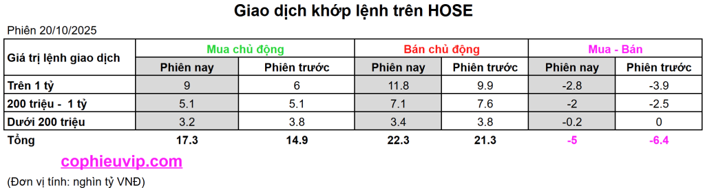 - Sự đồng thuận bán ròng của tất cả các nhóm: Cả ba nhóm nhà đầu tư (lớn, vừa, và nhỏ) đều thể hiện xu hướng bán ròng trong phiên 20/10/2025, cho thấy sự đồng thuận bán tháo trên diện rộng.