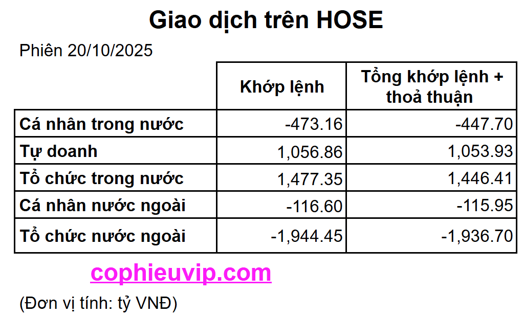 - Cá nhân trong nước: Bán ròng -473.16 tỷ VND (khớp lệnh) và -447.70 tỷ VND (tổng hợp). Cá nhân là nhóm bán tháo chính trong nước.
