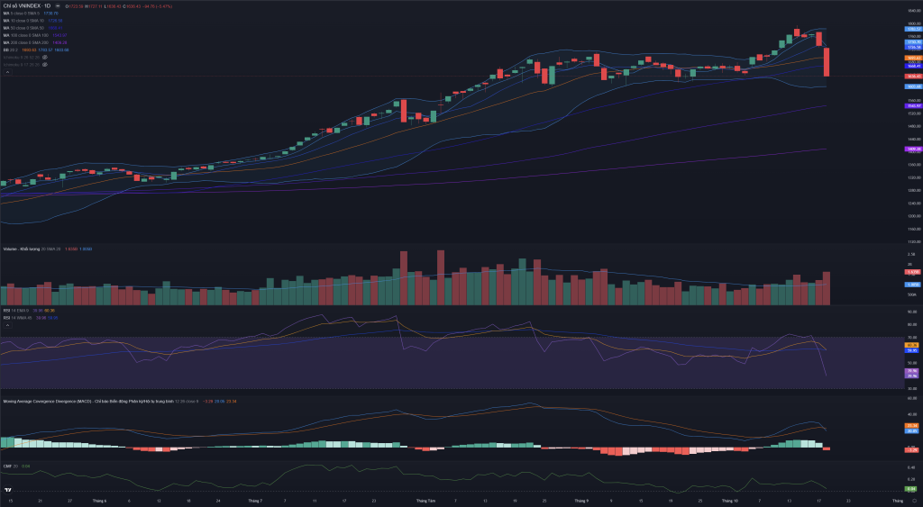 - Hình thái nến: Nến đỏ thân dài, giảm -94.76 điểm (-5.47%) tại mức 1,636.43 điểm. Nến có bóng trên và bóng dưới rất ngắn, cho thấy áp lực bán tháo dứt khoát.