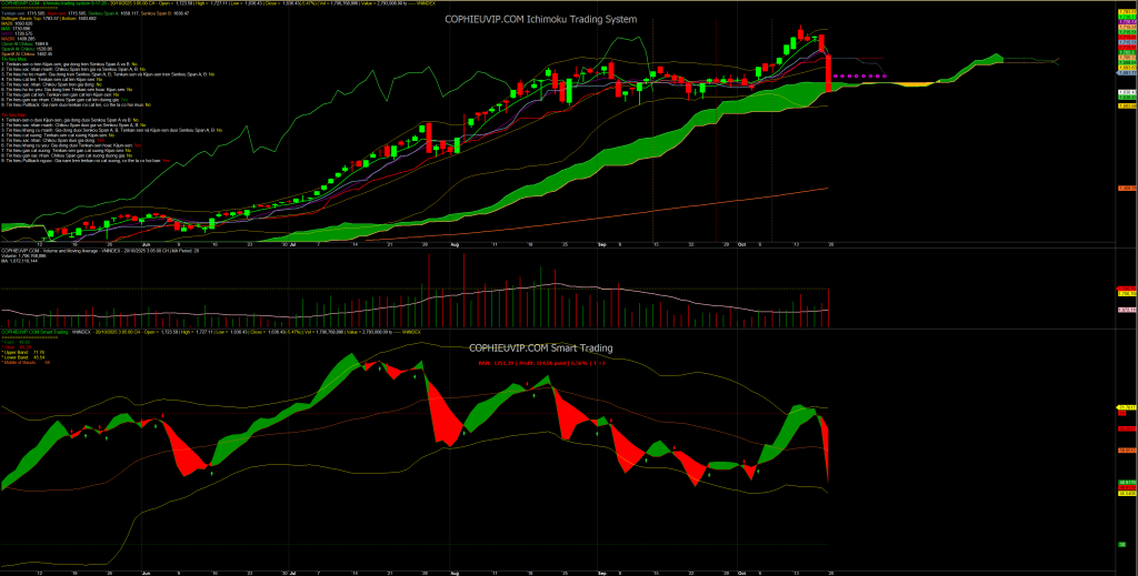 - Giá đóng cửa nằm dưới MA5 (1,730.70) và MA10 (1,726.58).