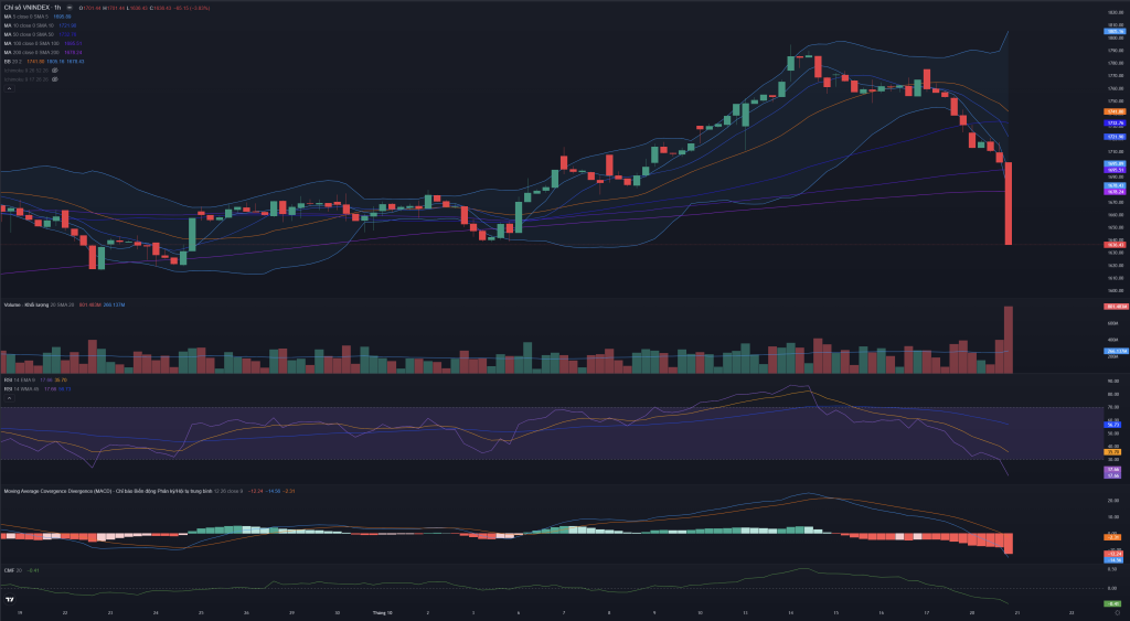 Phiên giao dịch 20/10/2025 là một phiên bán tháo hoảng loạn, với sự giảm điểm sâu và đồng thuận trên hầu hết các nhóm ngành.
