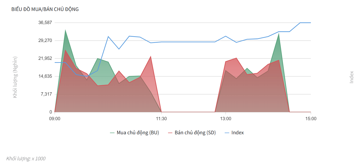 - Giai đoạn mở cửa và đầu phiên sáng (09:00 – 10:00): Ngay khi bước vào phiên khớp lệnh, thị trường chứng kiến sự bùng nổ cực mạnh từ phe Mua. Lực Mua chủ động (BU) tạo một cột đỉnh cao nhất toàn phiên, đạt mức xấp xỉ 36.587 đơn vị. Dù lực Bán chủ động (SD) cũng dâng cao tương ứng nhưng vẫn lép vế trước đà hưng phấn của phe Mua, giúp chỉ số Index có nhịp bật tăng nhanh ngay đầu ngày.