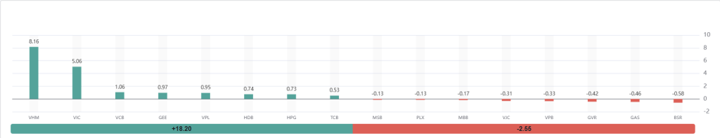- Các mã khác cũng đóng góp tích cực bao gồm: GEE (+0.97), VPL (+0.95), HDB (+0.74), HPG (+0.73) và TCB (+0.53).