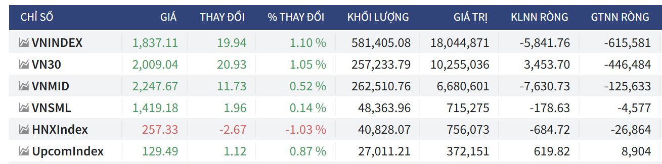 - Chỉ số VN-Index: Ghi nhận sự bứt phá mạnh mẽ khi đóng cửa tại 1,837.11 điểm, tăng +19.94 điểm (+1.10%). Khối lượng giao dịch đạt 581,405.08 đơn vị với tổng giá trị giao dịch xấp xỉ 18,044,871 triệu đồng. Khối ngoại bán ròng rất mạnh với giá trị -615,581 triệu đồng.