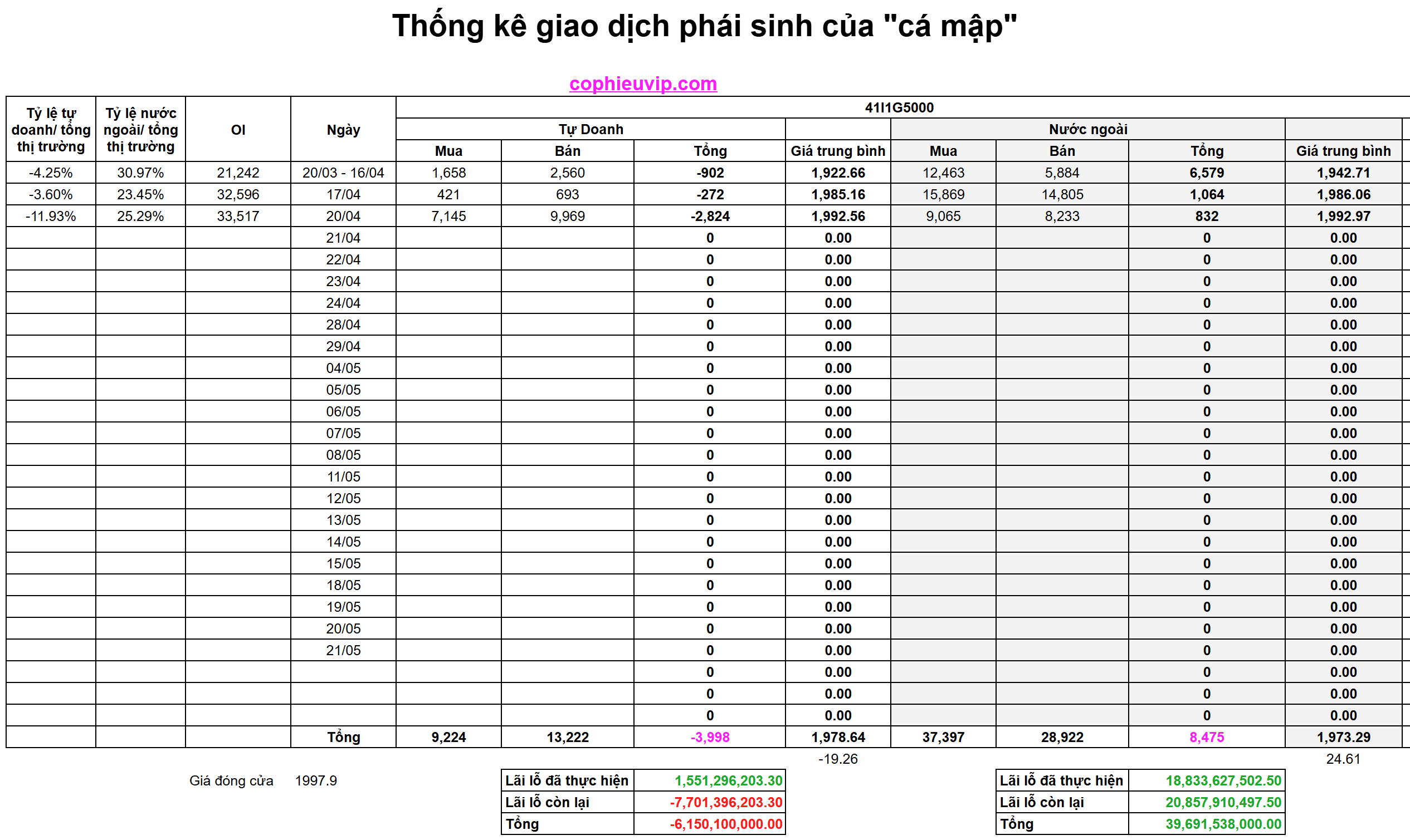 Dữ liệu phái sinh phiên 20/04/2026 phản ánh một cuộc đối đầu nảy lửa giữa Tự doanh và Khối ngoại. Trong khi Khối ngoại vẫn miệt mài bồi đắp vị thế Long lũy kế lên hơn 8.400 hợp đồng, thì Tự doanh đã bắt đầu có dấu hiệu “sợ độ cao” khi thực hiện cú Short ròng kỷ lục trong phiên để gia tăng vị thế thủ lên gần 4.000 hợp đồng. Đặc biệt, việc Basis âm sâu (-11,14) là một lời cảnh báo kỹ thuật quan trọng; nó cho thấy phe phái sinh không hề “tin” vào cú kéo vượt mốc 2.000 điểm của VN30 hôm nay. Với sự thận trọng này, kịch bản thị trường cơ sở rung lắc để “trả điểm” trong các phiên tới là rất cao. Cần lưu ý vị thế cơ sở nếu Basis không sớm thu hẹp trong phiên mai.