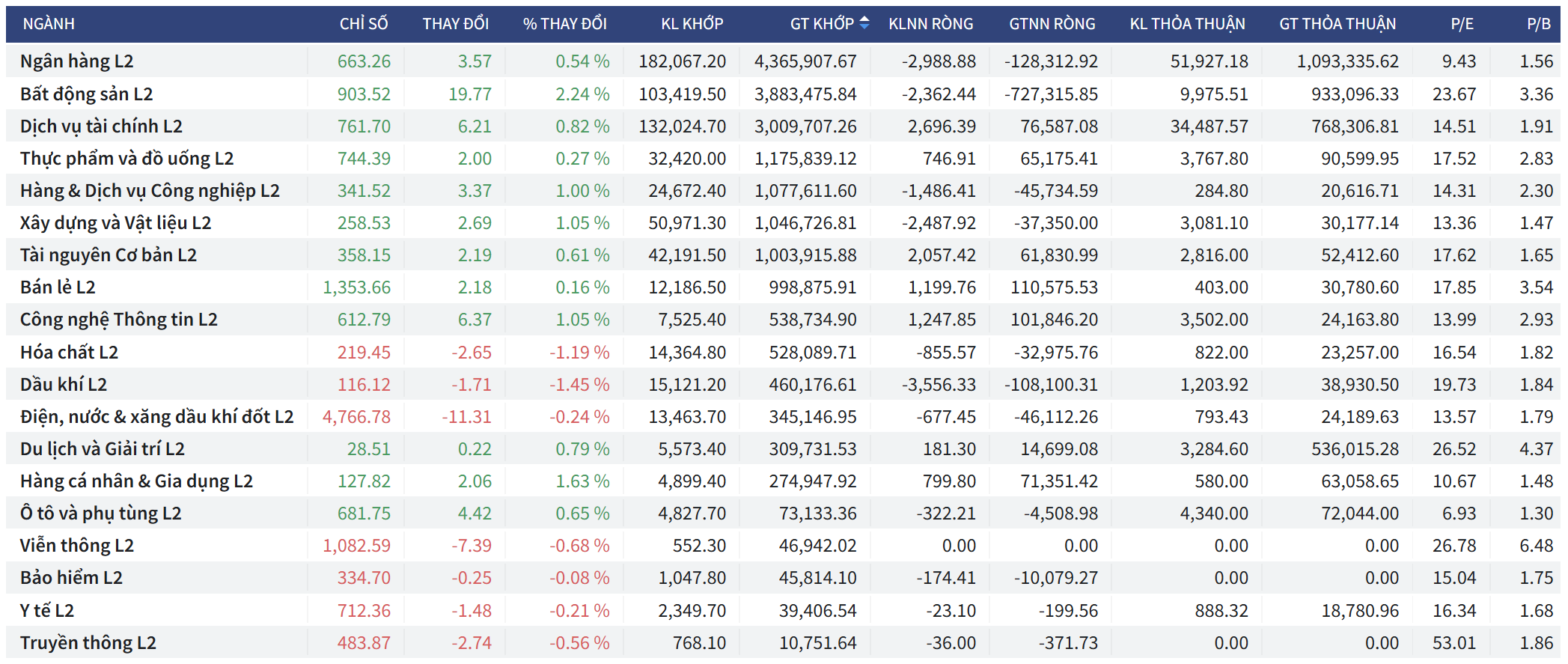 - Chỉ số VNMID (Midcap) và VNSML (Smallcap): Cả hai nhóm đều duy trì sắc xanh nhưng mức tăng thấp hơn chỉ số chung. VNMID tăng +0.52% đạt 2,247.67 điểm; VNSML tăng nhẹ +0.14% đạt 1,419.18 điểm. Khối ngoại tiếp tục bán ròng ở cả hai phân khúc này, đặc biệt là nhóm Midcap bị bán ròng -125,633 triệu đồng.