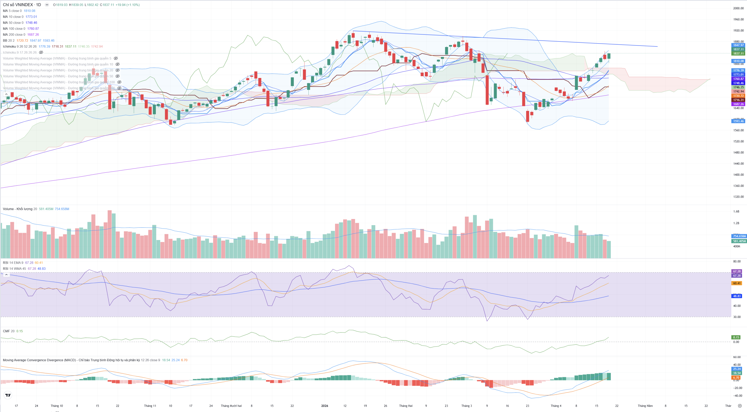 VN-Index phiên 20/04/2026 đã trình diễn một cú “lật kèo” ngoạn mục, xác nhận vùng 1.800 là hỗ trợ thép trong ngắn hạn. Tín hiệu nến rút chân Hammer đi kèm với chỉ báo CMF cải thiện cho thấy dòng tiền nội đang rất quyết liệt bảo vệ xu hướng tăng. Tuy nhiên, việc “kéo trụ” lộ liễu với thanh khoản thấp và hiện tượng phân kỳ ẩn RSI là những rủi ro không thể ngó lơ. Thị trường đang bước vào giai đoạn “nước rút” để chinh phục đỉnh 1.880, nhưng đây là cuộc chơi dành cho các cổ phiếu dẫn dắt (VHM, VIC, Ngân hàng), không phải là bữa tiệc cho tất cả.