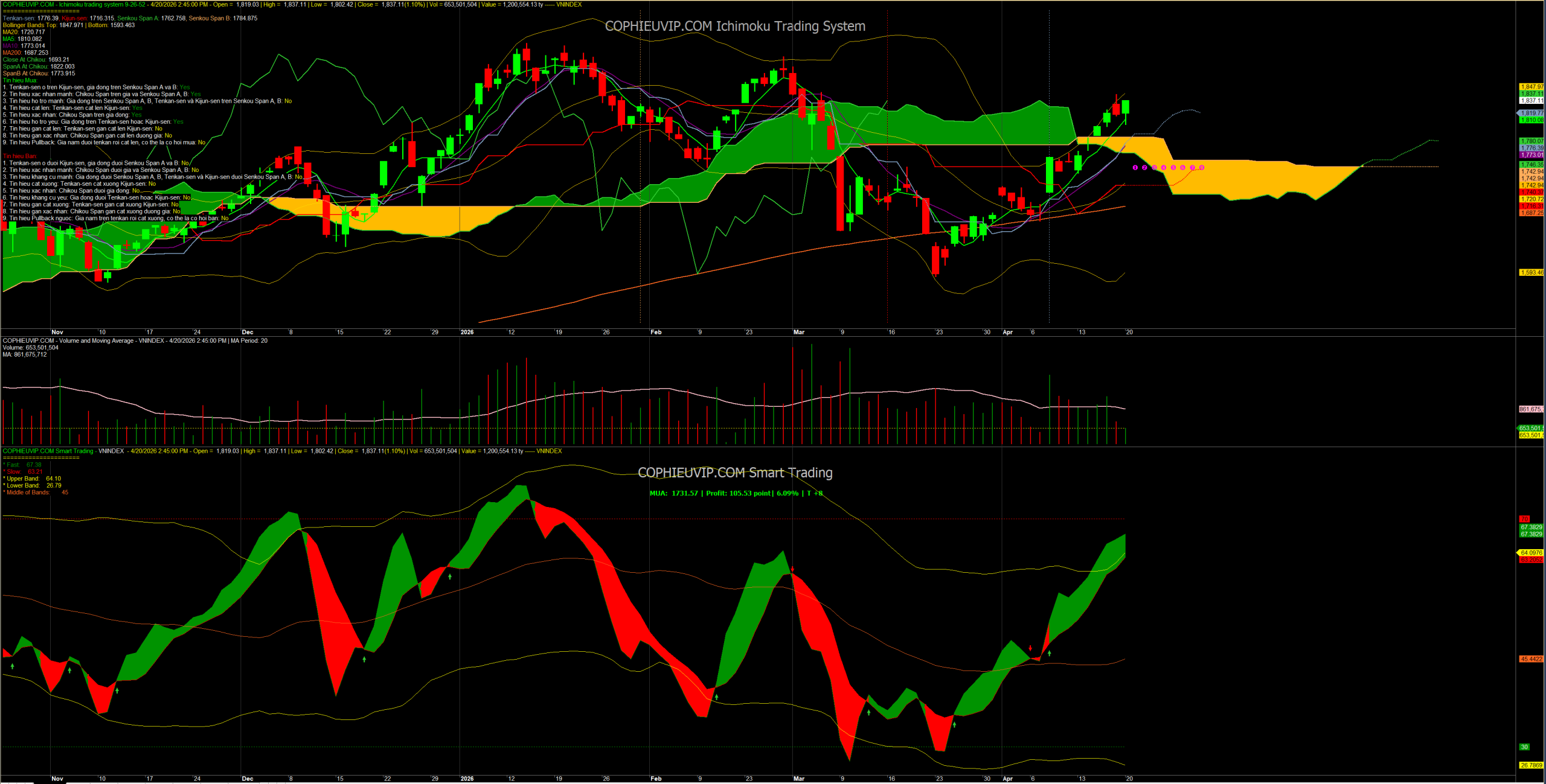 - Diễn biến: Dòng tiền sau khi kéo họ nhà Vin sẽ luân chuyển sang nhóm Ngân hàng (đón tin lợi nhuận Q1 của MBB, VPB) và nhóm Dầu khí (phản ứng muộn với giá dầu thế giới). VN-Index bứt phá mạnh mẽ vượt 1.845.