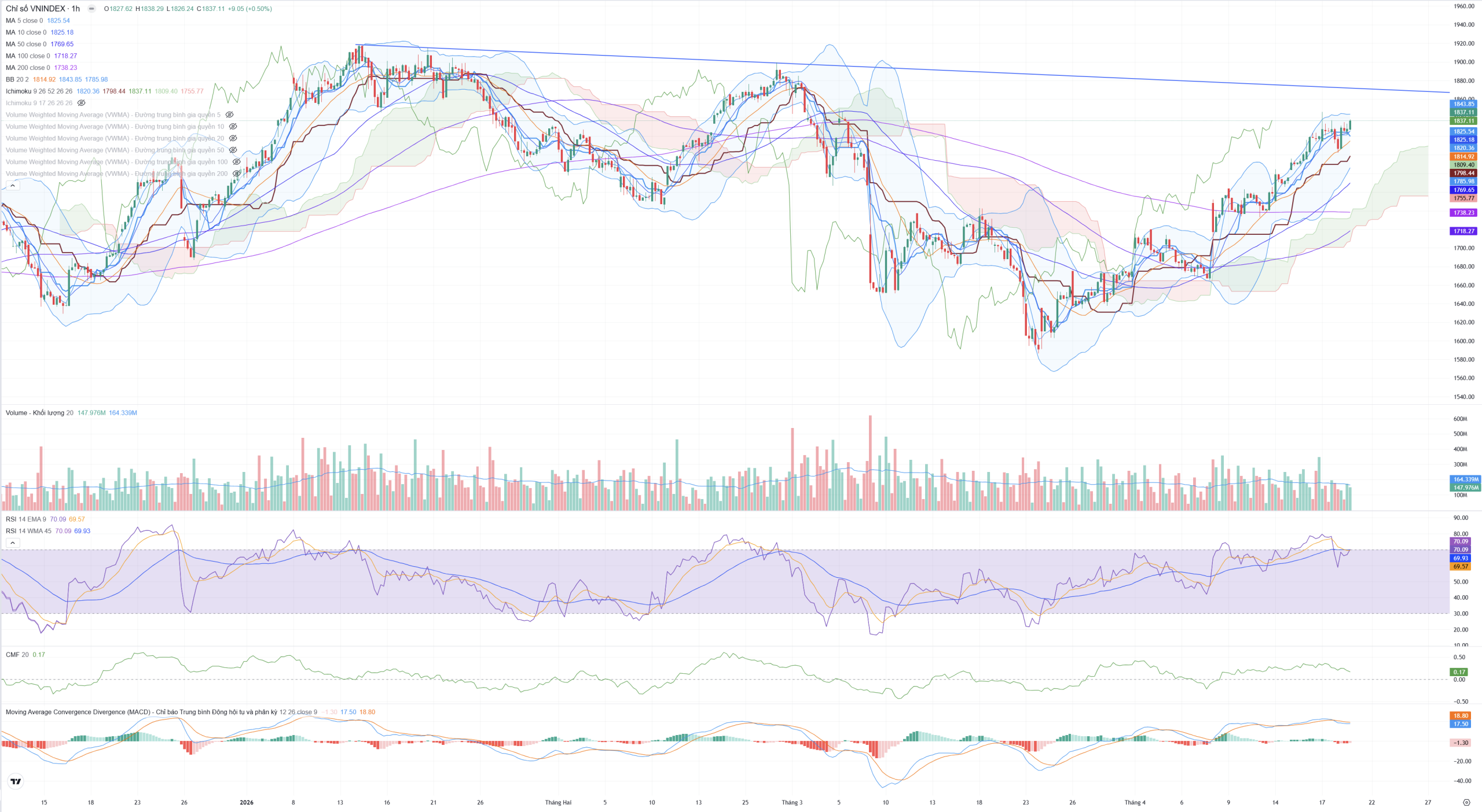 Dữ liệu khung giờ (H1) kết thúc phiên 20/04/2026 cho thấy một bộ mặt tích cực của thị trường khi phe Mua kiểm soát hoàn toàn giờ giao dịch cuối cùng. Chỉ số đã lấy lại các mốc hỗ trợ ngắn hạn và đang tiến sát vùng quá mua. Tuy nhiên, việc thanh khoản chưa đồng thuận với đà tăng là một “hạt sạn” lớn, cho thấy tâm lý thận trọng vẫn còn hiện hữu. Dự báo phiên sáng mai (21/04) sẽ tiếp tục quán tính tăng điểm để kiểm định vùng 1.840 – 1.845. Nhà đầu tư nên quan sát kỹ khối lượng giao dịch tại vùng kháng cự này; nếu thanh khoản không gia tăng, rủi ro xuất hiện nhịp điều chỉnh kỹ thuật về lại 1.825 là rất lớn.