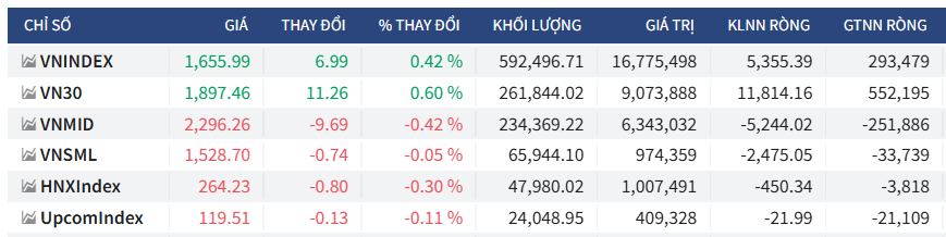 - Chốt phiên, VN-Index tăng 6,99 điểm (+0,42%) lên mức 1.655,99 điểm; HNX-Index giảm 0,8 điểm (-0,3%) xuống 264,23 điểm; UPCoM-Index giảm 0,13 điểm (-0,11%) xuống 119,51 điểm