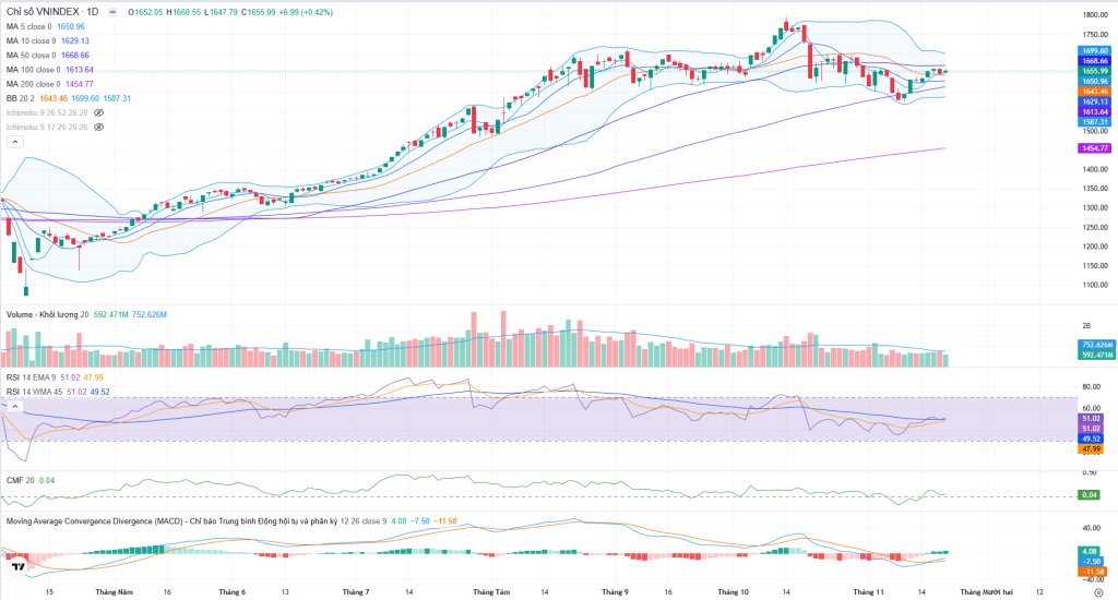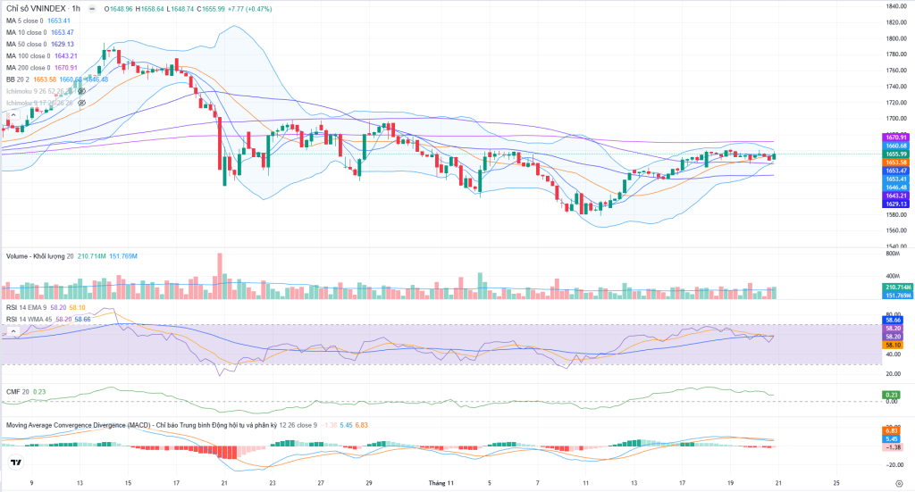 - Cấu trúc giá: Chỉ số đang duy trì cấu trúc Đáy sau cao hơn (L: 1,648.74 cao hơn đáy gần nhất). Đỉnh (H: 1,658.64) vẫn thấp hơn đỉnh gần nhất (H: 1,660.55). Cấu trúc đang ở trạng thái tích lũy/giằng co dưới kháng cự.