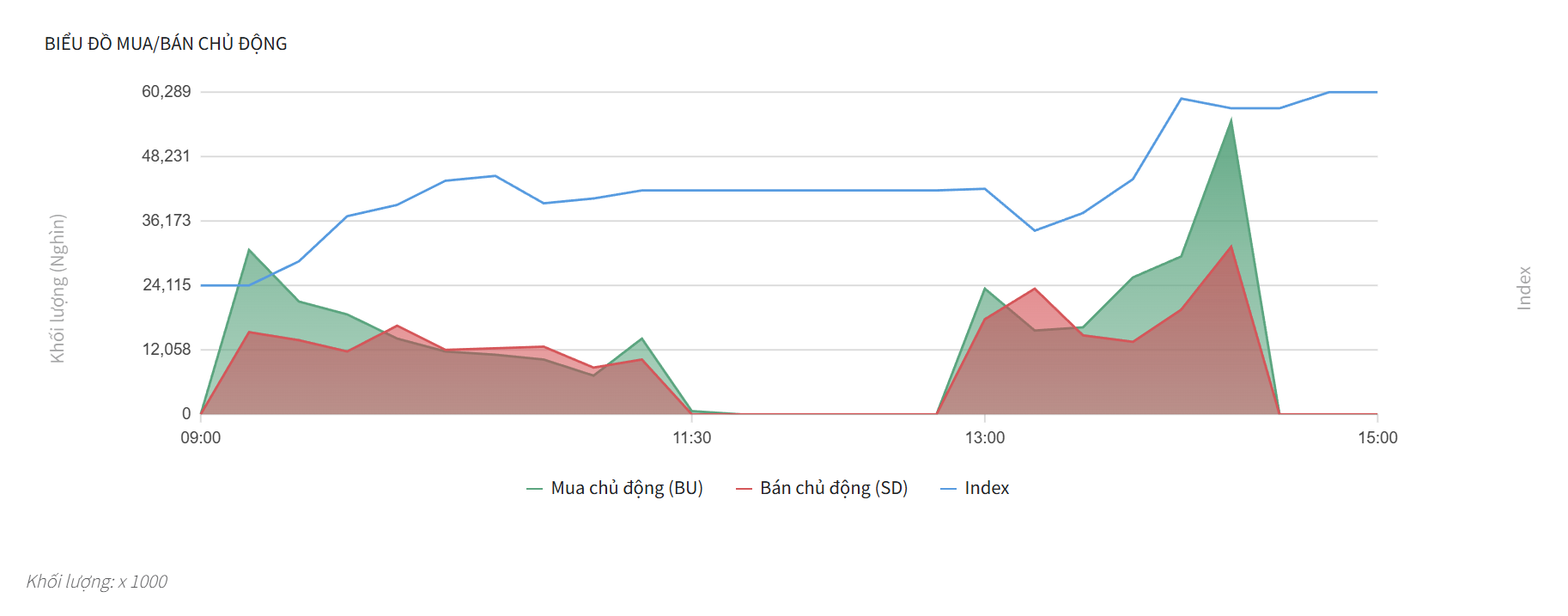 - Tương quan tổng thể: Biểu đồ cho thấy bên Mua chủ động (BU) hoàn toàn làm chủ thế trận và duy trì sức mạnh áp đảo so với bên Bán chủ động (SD) trong hầu hết thời gian giao dịch. Sự quyết liệt của phe mua đặc biệt bùng nổ mạnh mẽ trong phiên chiều, trực tiếp đẩy chỉ số VN-Index vượt qua ngưỡng tâm lý 1,700 và đóng cửa ở mức cao nhất phiên tại 1,704.31 điểm.