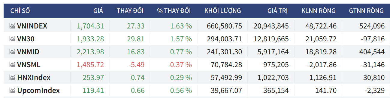- Chỉ số VNINDEX: Đóng cửa tại mức 1,704.31 điểm, tăng mạnh 27.33 điểm (+1.63%). Khối lượng giao dịch đạt 660,580.75 đơn vị với giá trị giao dịch tương ứng là 20,943,845 triệu VNĐ. Khối ngoại mua ròng 48,722.46 đơn vị, tương ứng giá trị mua ròng đạt 524,096 triệu VNĐ.