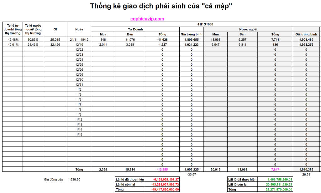 - Thông số thị trường: Giá đóng cửa đạt 1.936,90. Chỉ số Basis dương +3,53 và OI tăng vọt lên 32.126 hợp đồng. Việc OI tăng mạnh sau ngày đáo hạn cho thấy dòng tiền mới đang nhập cuộc rất lớn, sẵn sàng cho một kịch bản biến động mạnh tiếp theo khi hợp đồng tháng 1 bắt đầu vào giai đoạn cao điểm.