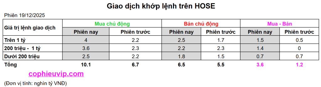 Kết luận sơ bộ: Phiên giao dịch ngày 19/12/2025 ghi nhận sự bùng nổ của dòng tiền mua chủ động với tổng giá trị tăng vọt lên trên 10 nghìn tỷ VNĐ. Điểm đáng chú ý nhất là sự dẫn dắt quyết liệt từ các lệnh có giá trị lớn (trên 1 tỷ VNĐ) và nhóm lệnh trung bình (200 triệu – 1 tỷ VNĐ), cho thấy các nhà đầu tư tổ chức và dòng tiền lớn đã nhập cuộc mạnh mẽ, tạo ra mức thặng dư mua ròng chủ động áp đảo để đẩy chỉ số VN-Index bứt phá.
