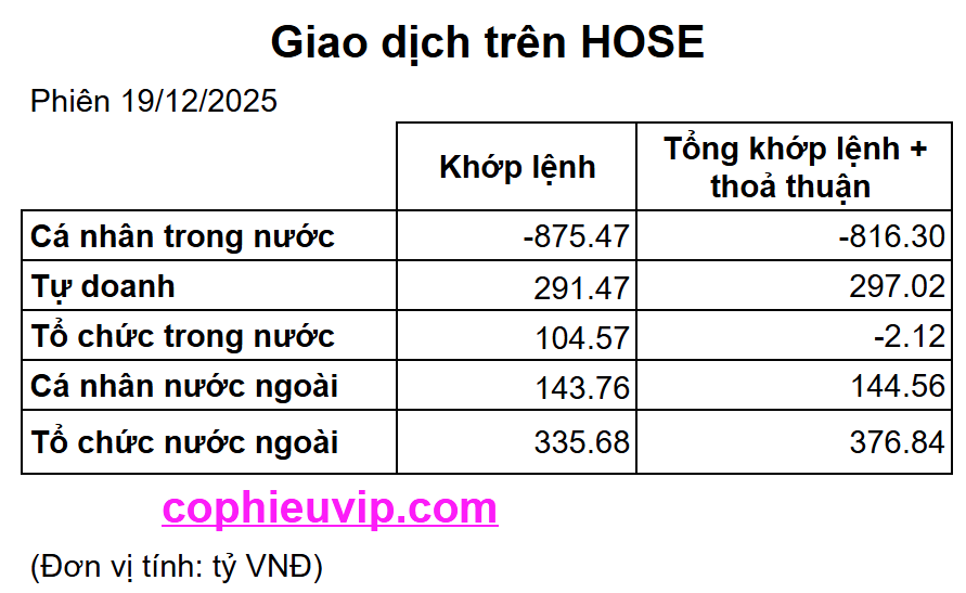 Kết luận sơ bộ: Phiên giao dịch ngày 19/12/2025 chứng kiến sự đối ứng quyết liệt về dòng tiền: trong khi các Cá nhân trong nước mạnh tay bán ròng (hơn 800 tỷ VNĐ) thì toàn bộ các nhóm còn lại, đặc biệt là Tổ chức nước ngoài và Tự doanh, đã hấp thụ hết lượng hàng này thông qua vị thế mua ròng áp đảo. Động thái cơ cấu danh mục của quỹ Fubon và dòng vốn vào nhẹ tại Diamond ETF cũng góp phần hỗ trợ tâm lý thị trường, bất chấp giá trị giao dịch thỏa thuận có sự sụt giảm so với phiên liền trước.