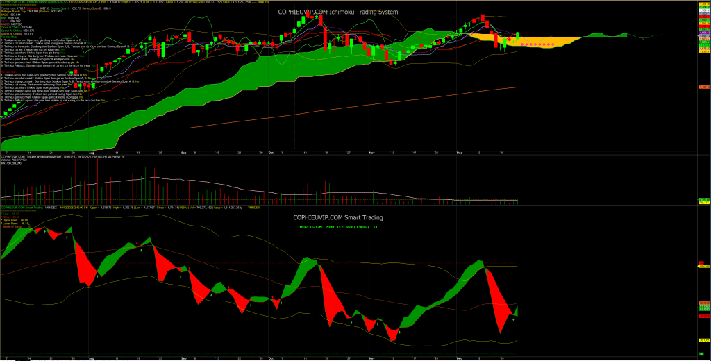 - Hành động của nhà đầu tư (Vị thế đang có): Giữ nguyên vị thế, quan sát sự vận động của chỉ báo Smart Trading, nếu dải màu xanh bắt đầu thu hẹp thì cân nhắc hạ bớt phần Margin.