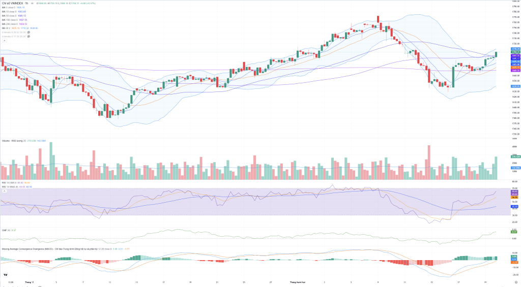 - Giá đóng cửa (1,704.31) đã thành công vượt lên trên MA50 (1,678.61) và đặc biệt là MA20 (1,697.94), xác nhận xu hướng ngắn hạn đã chuyển dịch sang trạng thái tăng giá.