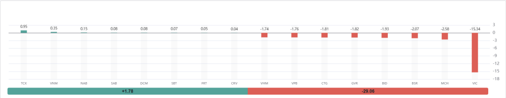 • Nhóm cổ phiếu kéo giảm chỉ số gây áp lực tàn khốc với tổng cộng -29,06 điểm.