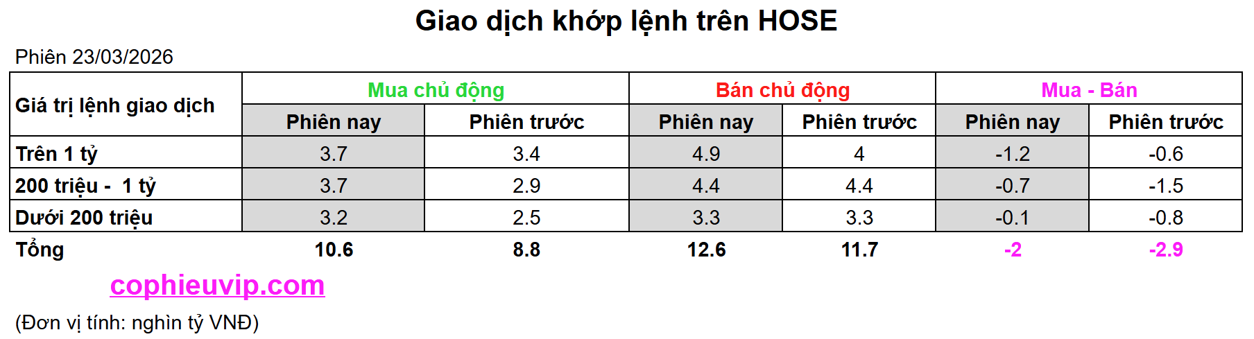 Biểu đồ mua bán chủ động phiên 23/03/2026 là hình ảnh thu nhỏ của một phiên “Panic Selling” (Bán tháo hoảng loạn) điển hình. Lực bán chủ động đạt đỉnh vào cuối phiên chiều với khối lượng kỷ lục cho thấy áp lực giải chấp margin và tháo chạy đã diễn ra ở mức độ cực đoan. Tuy nhiên, việc xuất hiện cột mua chủ động khá lớn (trên 40.000 đơn vị) ngay trước cú rơi cuối cùng cho thấy dòng tiền bắt đáy đã bắt đầu “nhập cuộc”, dù bị tạm thời đè bẹp.