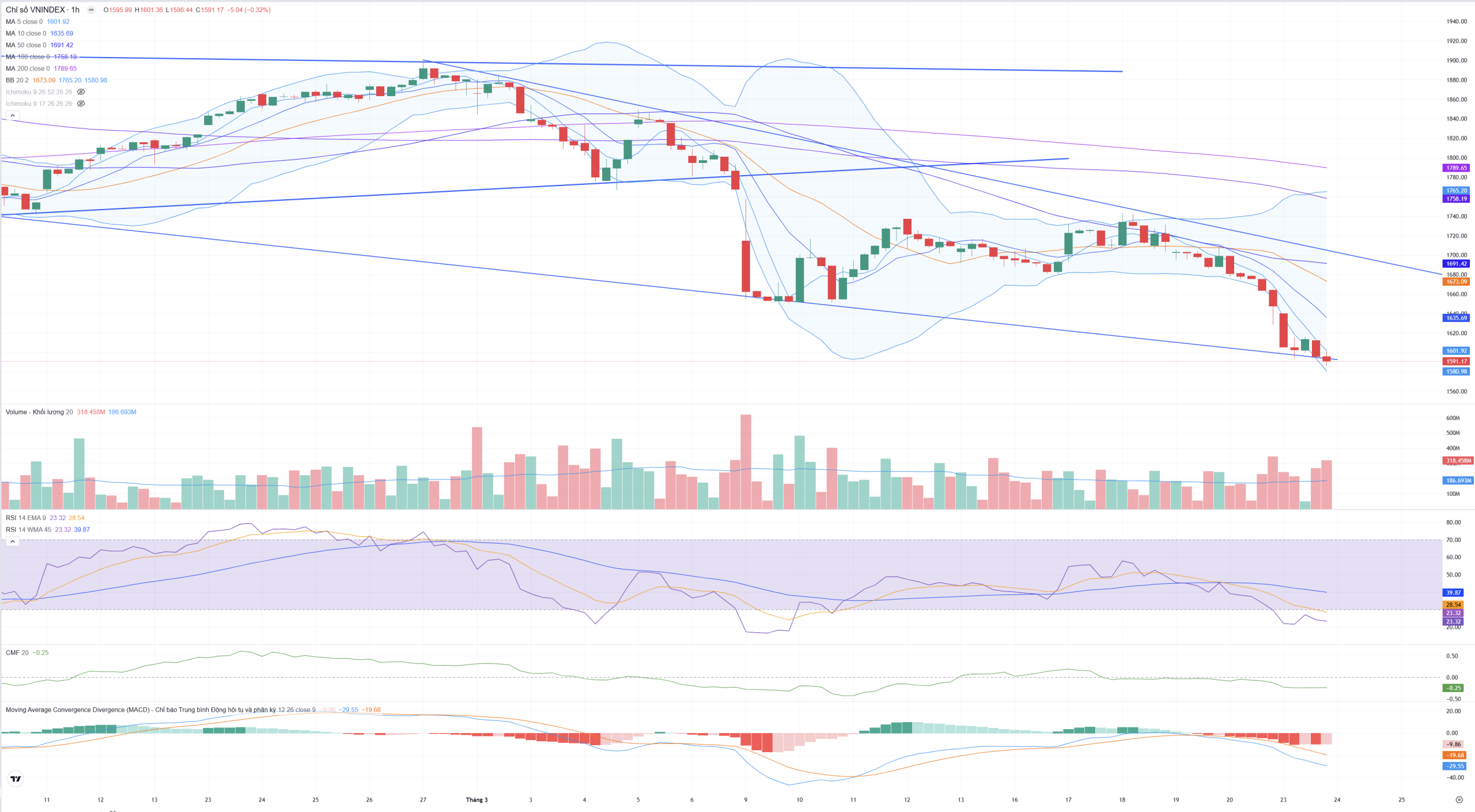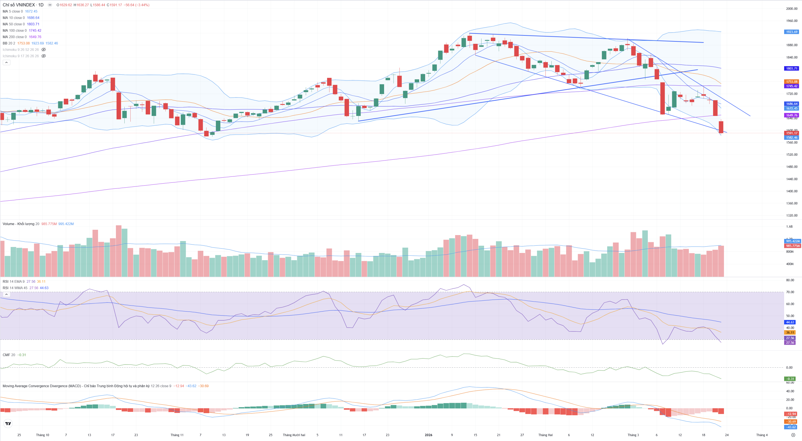 • Dải Bollinger Bands đang mở rộng tối đa theo hướng đi xuống (dốc đứng). Giá đóng cửa vẫn đang “bám” sát dải dưới (Lower Band tại 1.580,98).