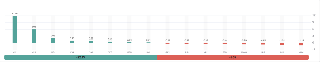 - VIC (Vingroup): Tiếp tục là “linh hồn” của đà tăng khi đóng góp tới +11.90 điểm. Mặc dù đã giảm nhiệt so với mức đóng góp +22 điểm của phiên trước, VIC vẫn duy trì sức ảnh hưởng tuyệt đối lên chỉ số chung.
