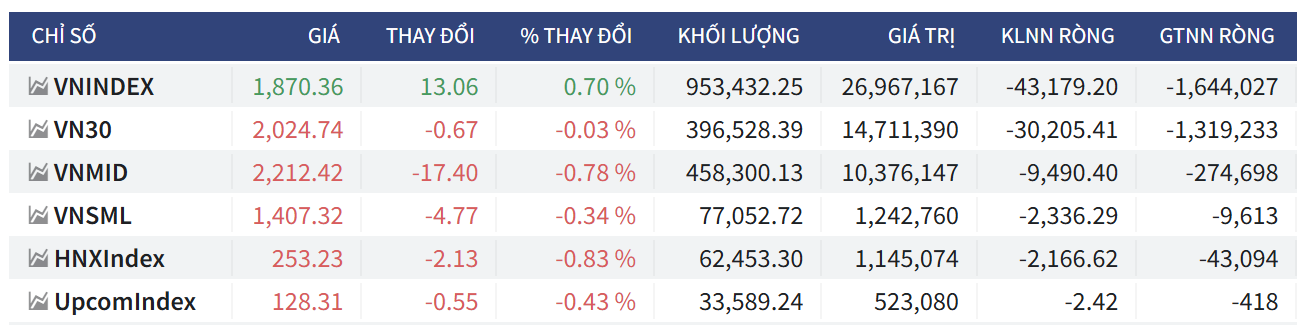 - Chỉ số đóng cửa tại 1.870,36 điểm, tăng nhẹ +13,06 điểm (+0,70%).