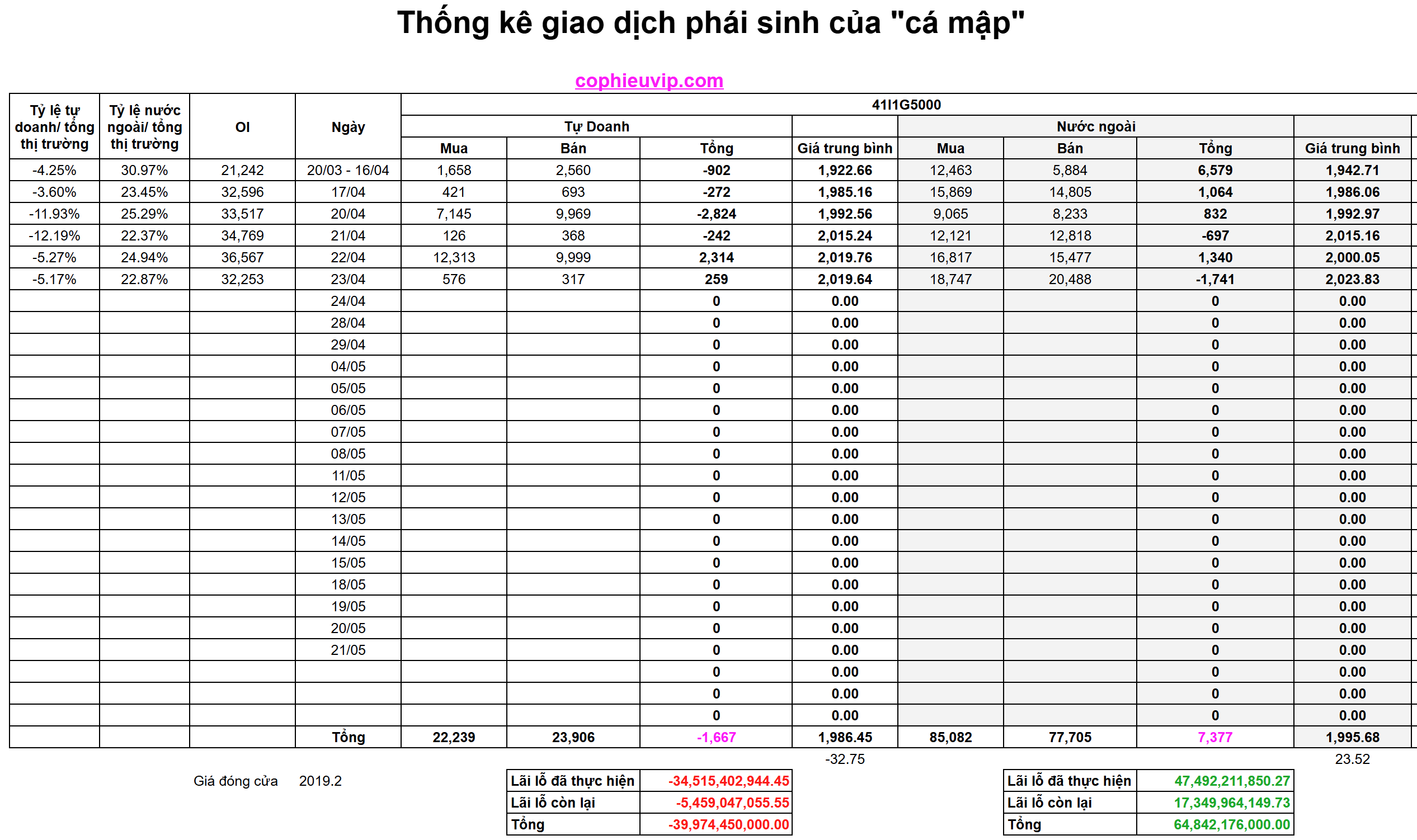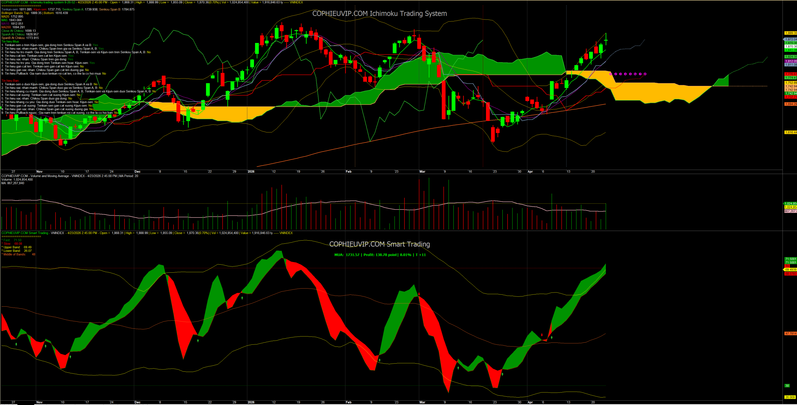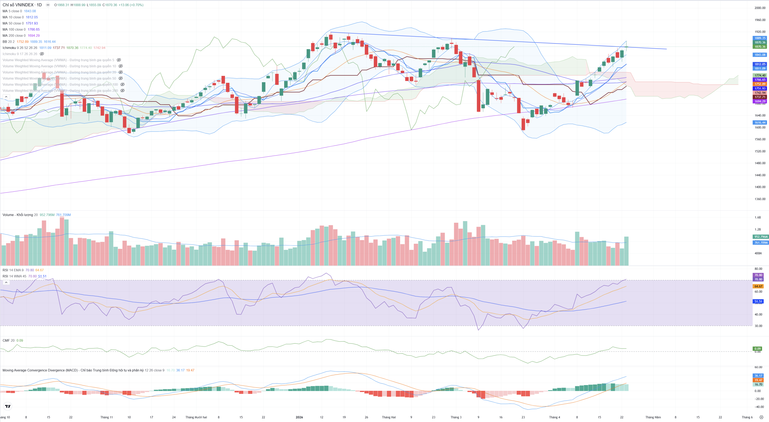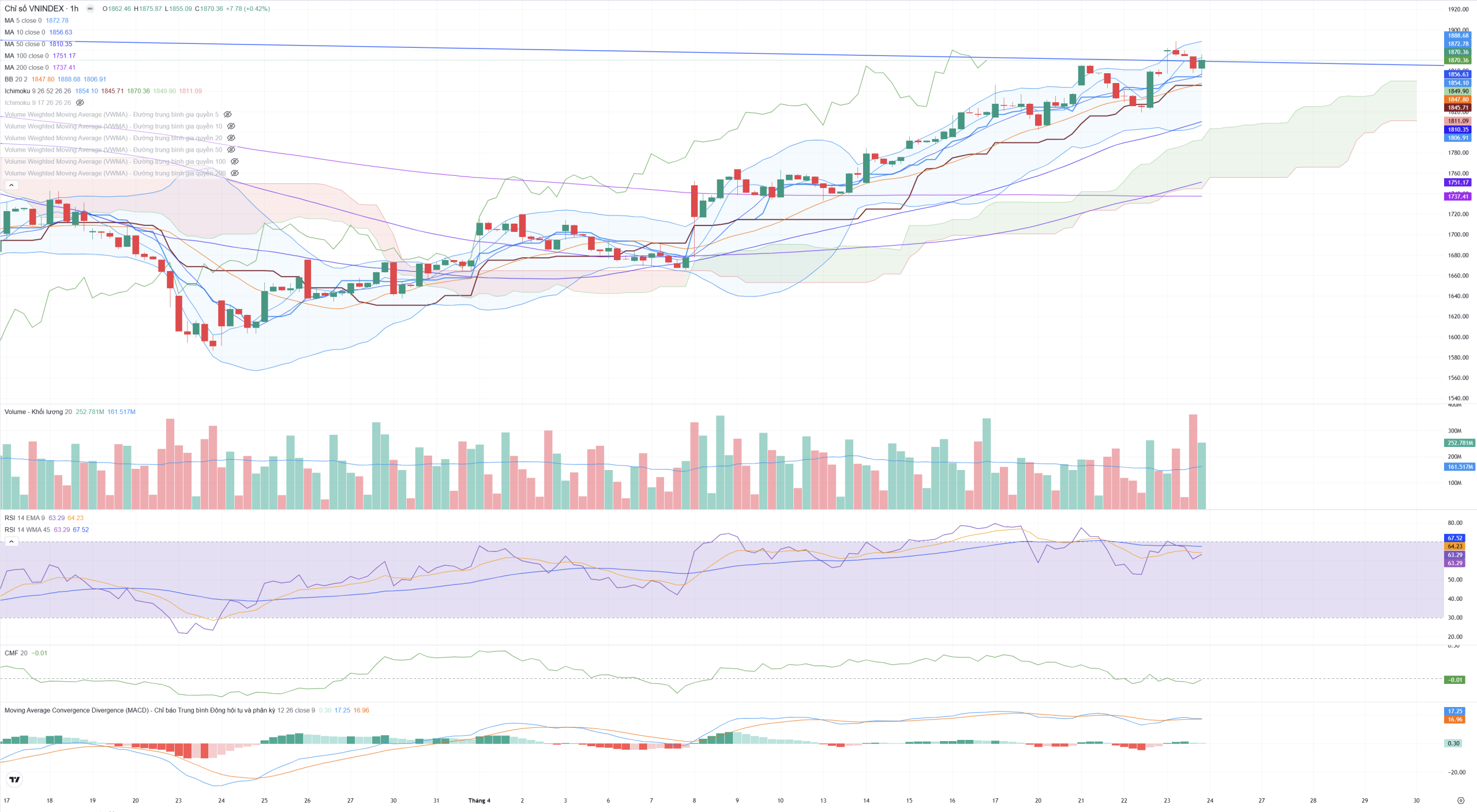 Đồ thị Daily phiên 23/04/2026 phản ánh một trạng thái “nguy hiểm đỏ” về mặt kỹ thuật. Sự kết hợp giữa Nến Doji chân dài, Volume phân phối kỷ lục và Phân kỳ ẩn giảm giá cho thấy thị trường đang ở vùng đỉnh cực kỳ rủi ro. Phe Mua đã dồn toàn lực vào các siêu trụ nhưng không thể phá vỡ đỉnh cũ 1.899. Chiến lược ưu tiên lúc này là thực hiện hóa lợi nhuận, đưa tài khoản về trạng thái an toàn và tuyệt đối không mở vị thế mua mới trong các nhịp kéo rướn.