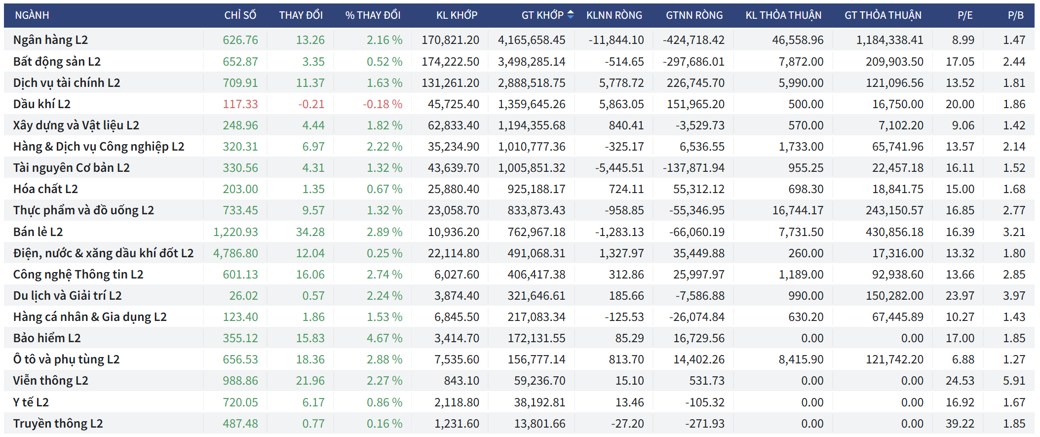 • VNSML (Nhóm vốn hóa nhỏ): Chỉ số tăng +29,01 điểm (+2,15%) đạt 1.377,62 điểm. Khối ngoại mua ròng nhẹ với giá trị +3,499 tỷ đồng.