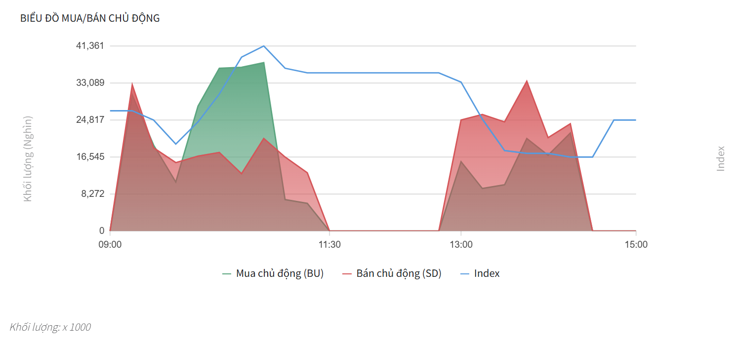 • Mở cửa phiên chiều, áp lực bán chủ động (SD) quay trở lại ngay lập tức. Các cột đỏ liên tục gia tăng và duy trì ở mức trung bình từ 25.000 đến 33.000 đơn vị.