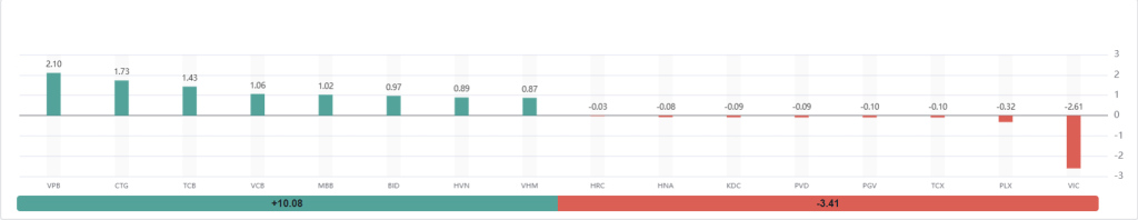 • Nhóm cổ phiếu nâng đỡ chỉ số đóng góp tích cực với tổng cộng +10.08 điểm.