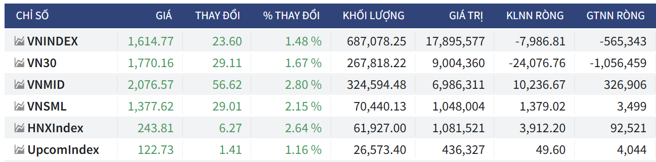 • VN-Index: Chỉ số đóng cửa tại mức 1.614,77 điểm, ghi nhận mức hồi phục mạnh +23,60 điểm (tương ứng +1,48%). Khối lượng giao dịch đạt 687.078,25 nghìn đơn vị với tổng giá trị giao dịch là 17.895,577 tỷ đồng. Khối ngoại tiếp tục xu hướng bán ròng với giá trị ròng đạt -565,343 tỷ đồng.