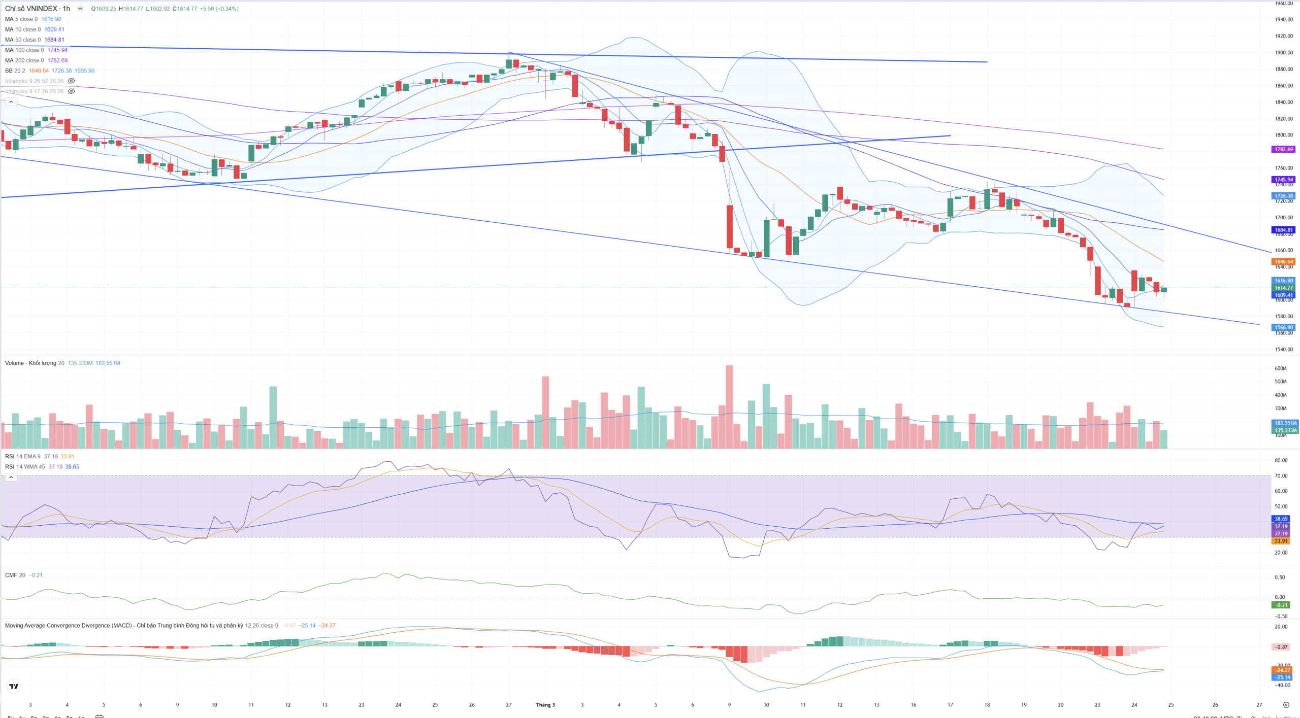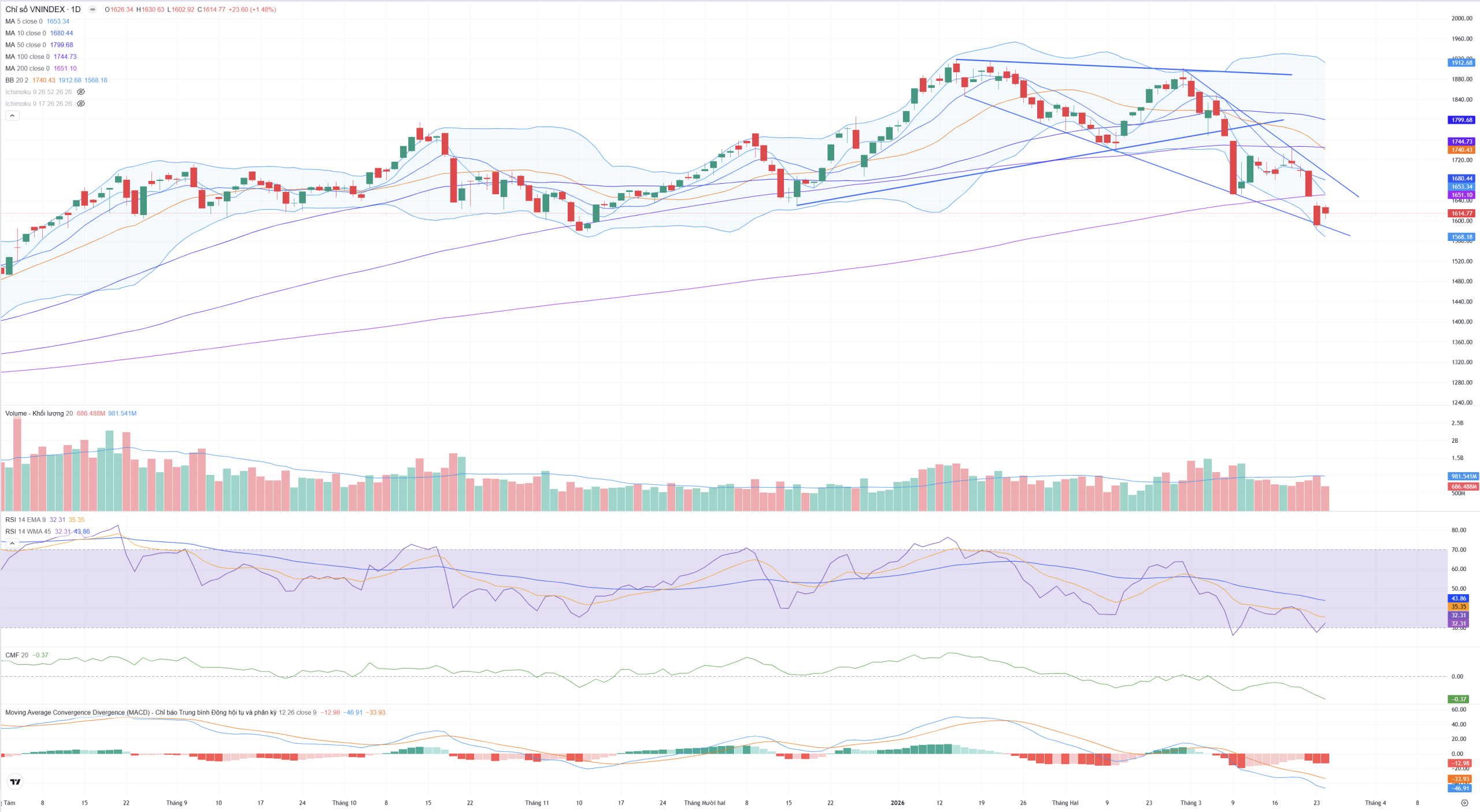 • Hệ thống các đường trung bình động lớn hơn như MA20 (1.646,64)MA50 (1.684,81) vẫn đang dốc xuống mạnh mẽ phía trên, đóng vai trò là những vùng kháng cự trung hạn rất lớn nếu nhịp hồi phục tiếp diễn.