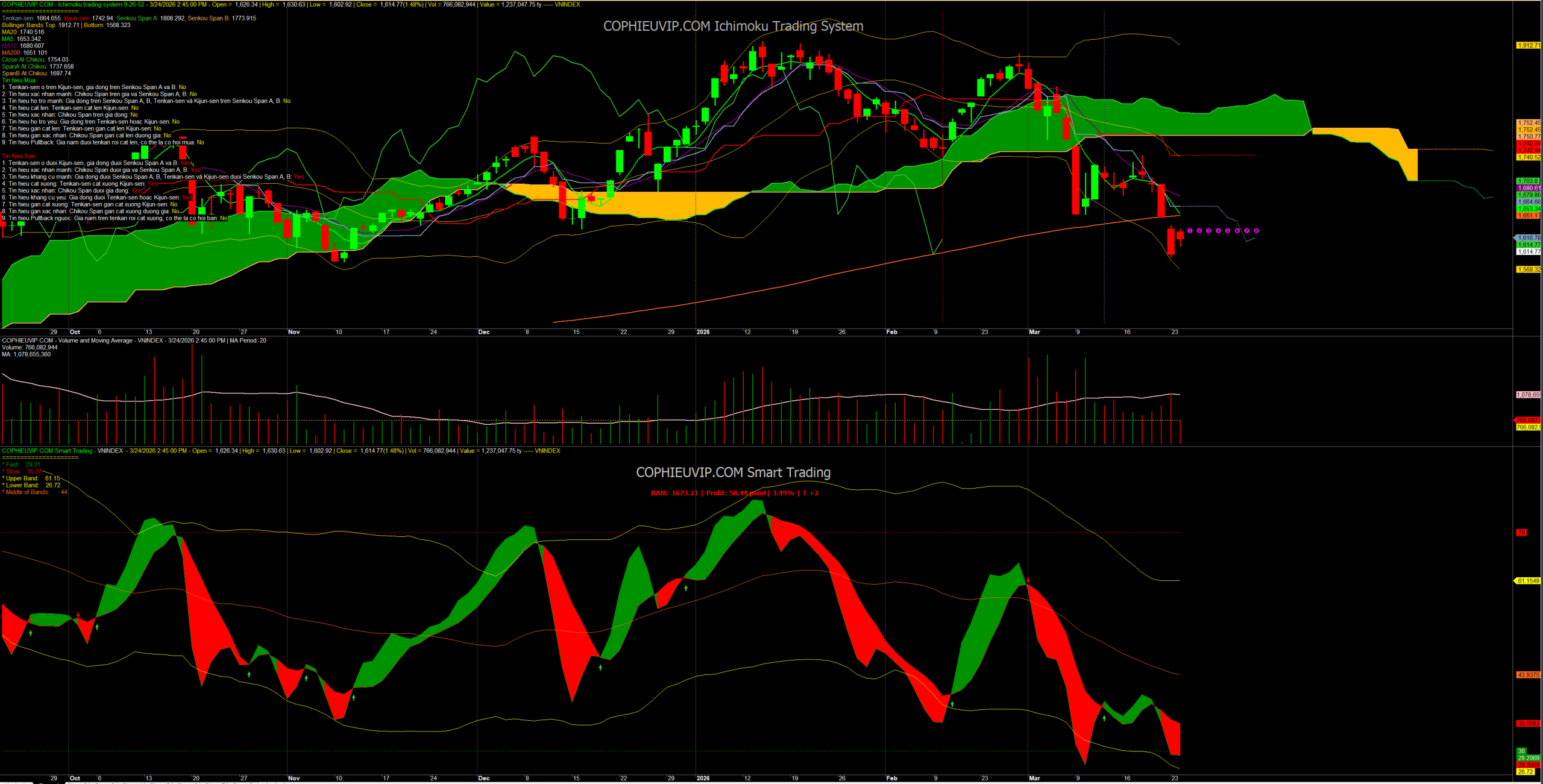 Kết luận sơ bộ: Thị trường phiên 24/03/2026 mang tính chất “hồi hình thức” nhiều hơn là hồi phục thực chất. Mặc dù chỉ số tăng hơn 23 điểm nhưng nội tại dòng tiền (CMF) lại đang rút ra mạnh mẽ hơn và thanh khoản mua lên rất yếu. VN-Index đang đứng trước nguy cơ chỉ là một nhịp hồi để “thoát hàng” trước khi tiếp tục tìm về các vùng hỗ trợ sâu hơn quanh 1.570.