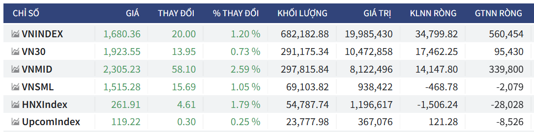 • Đóng cửa tại 1,680.36 điểm, tăng +20.00 điểm (+1.20%).