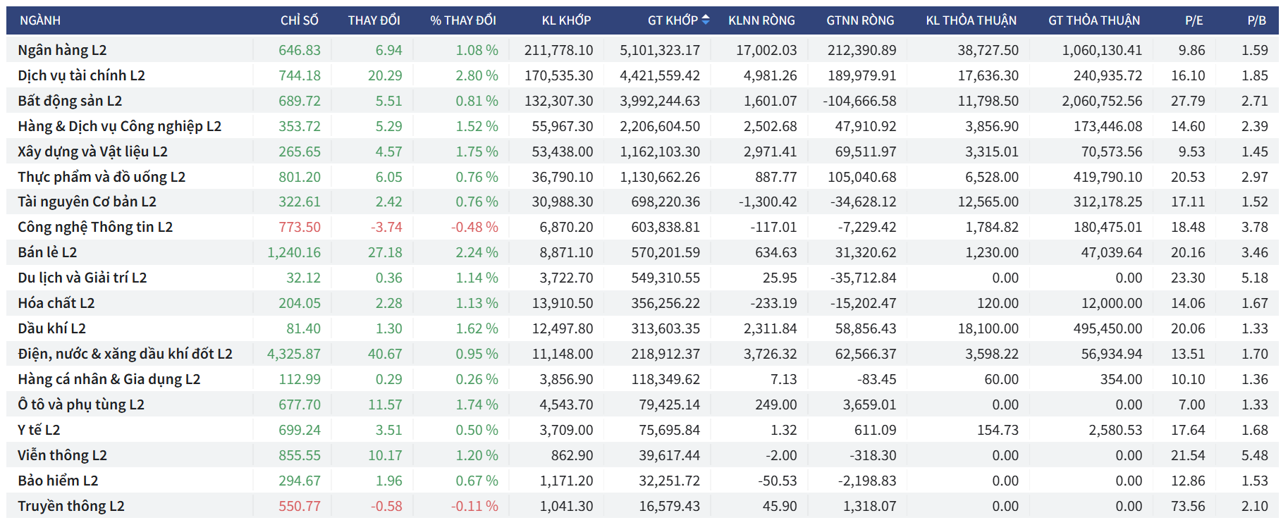 • Là nhóm tăng mạnh nhất với mức tăng +2.59% (tăng 58.10 điểm), đóng cửa tại 2,305.23 điểm.
