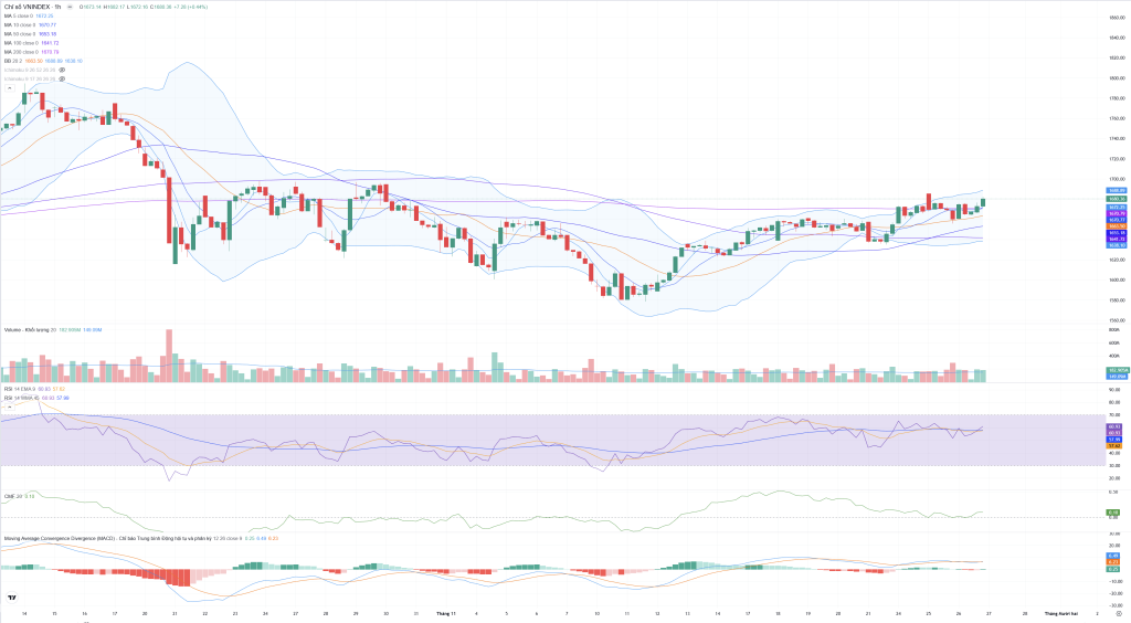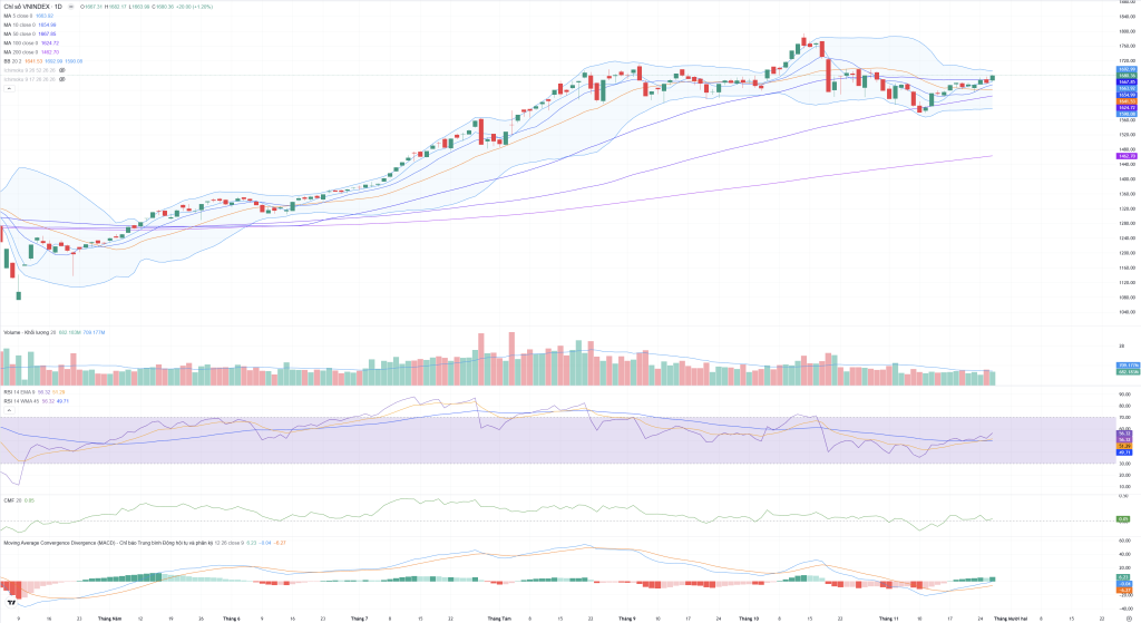• Vị trí giá: Giá đóng cửa nằm ở nửa trên của BB, đang tiến sát Dải trên BB (1,692.99).